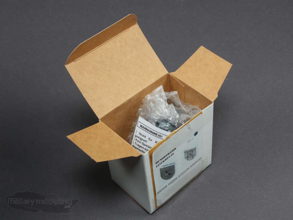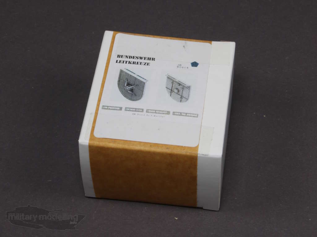 In einem kleinen Pappkarton mit Aufkleber kommt das Zubehör Bundeswehr Leitkreuze mit der Artikelnummer BWZ008 von 3D-Druck P. Warstat daher. Darin befinden sich 3D-Druck-Bauteile in einem Luftpolsterbeutel verpackt aus dunkelgrauem Druck-Resin. Enthalten sind 4 Leitkreuze.