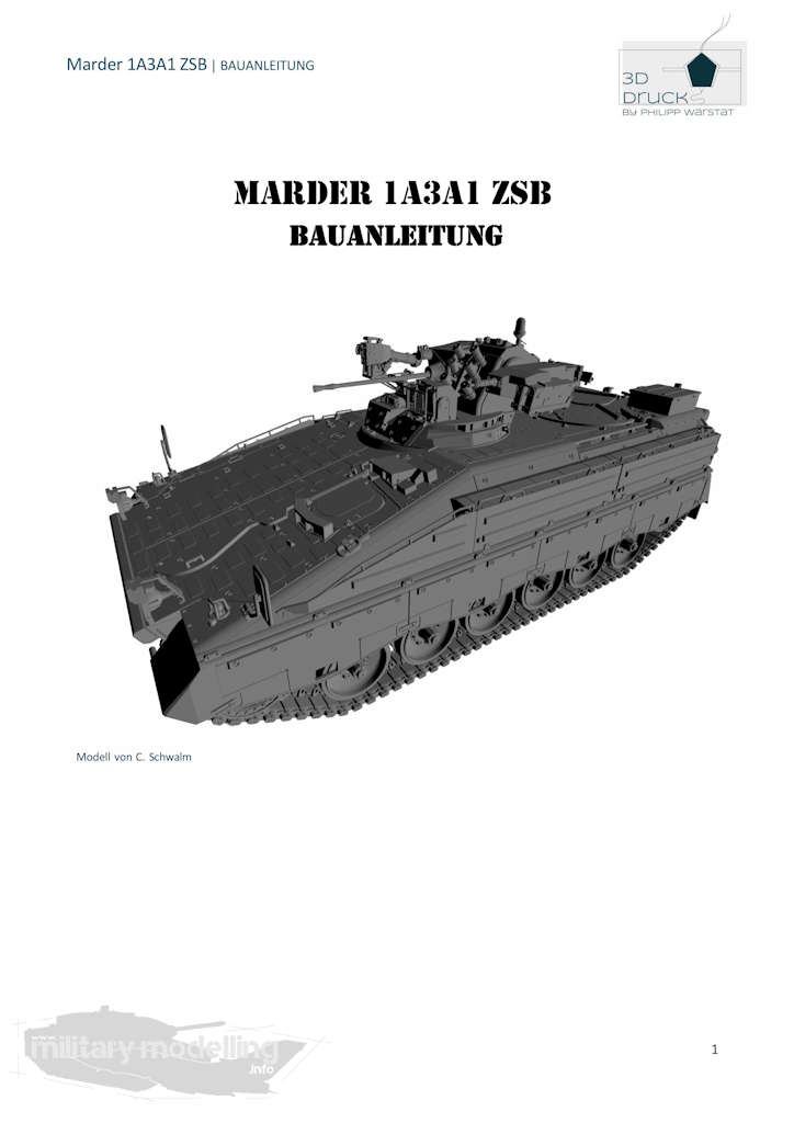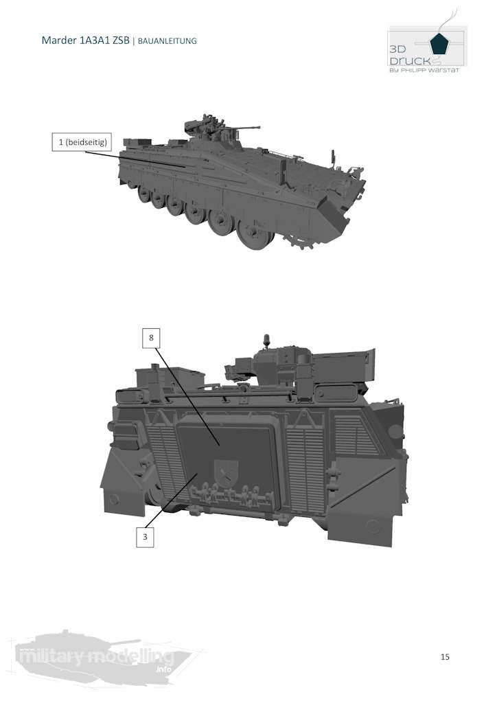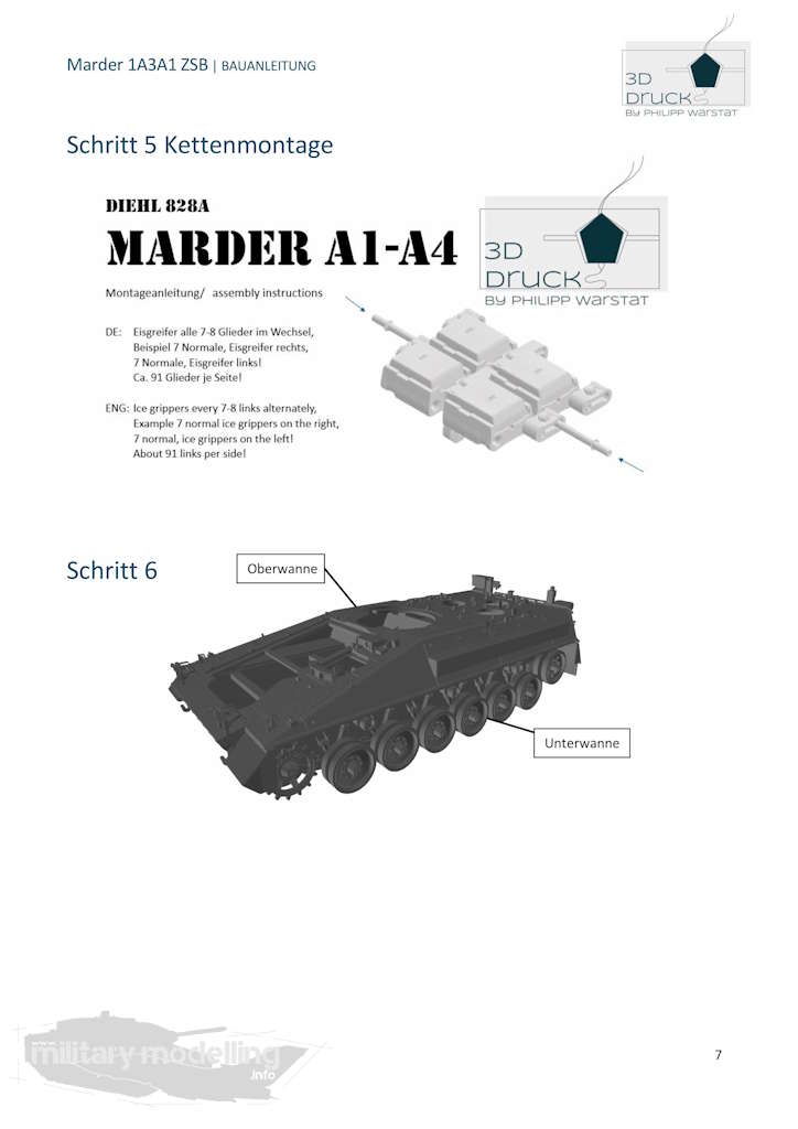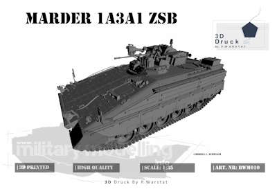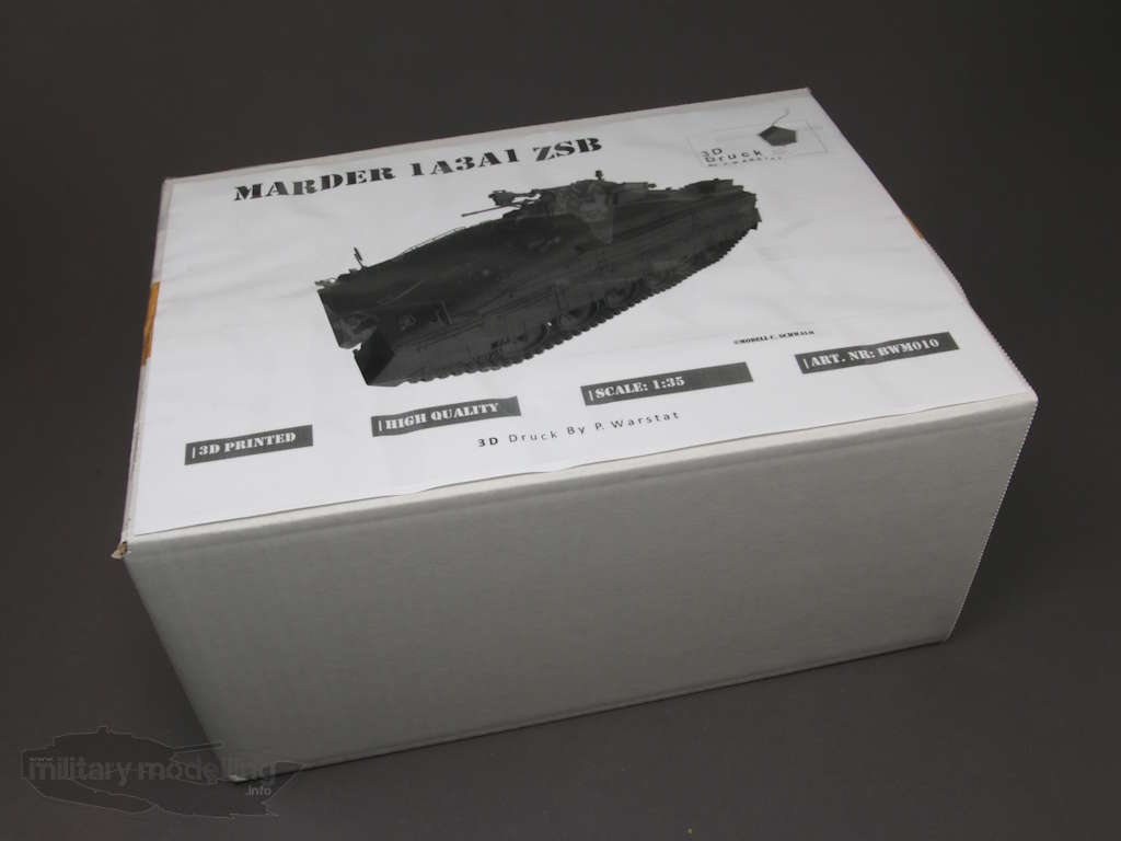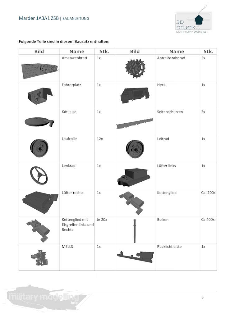 3D Druck P. Warstat liefert hier einen Multimix-Bausatz des Marder 1A3A1. Er besteht aus 3D-Druck-Resin-Bauteilen sowie Messingdrehteilen. Die Details sind hervorragend und stimmig. Die Bauteile stehen dem Original in nichts nach. Der Konstrukteur hat hier ganze Arbeit geleistet. Die Anleitung stimmig, ausführlich und verständlich. Der Druck der Bauteile ist hervorragend! Hier könnte sich so mancher 3D-Druck-Modell-Hersteller mal ein Beispiel nehmen.