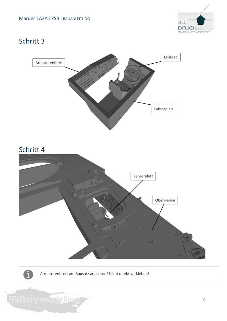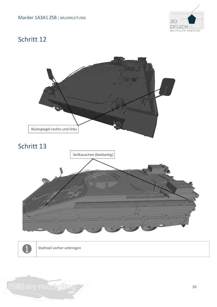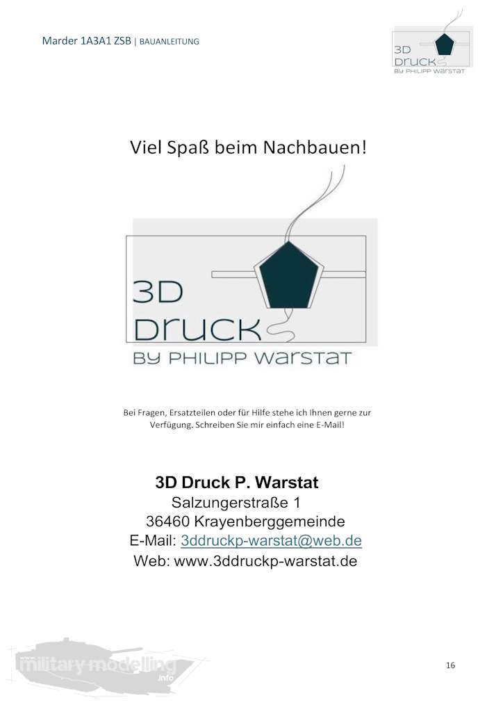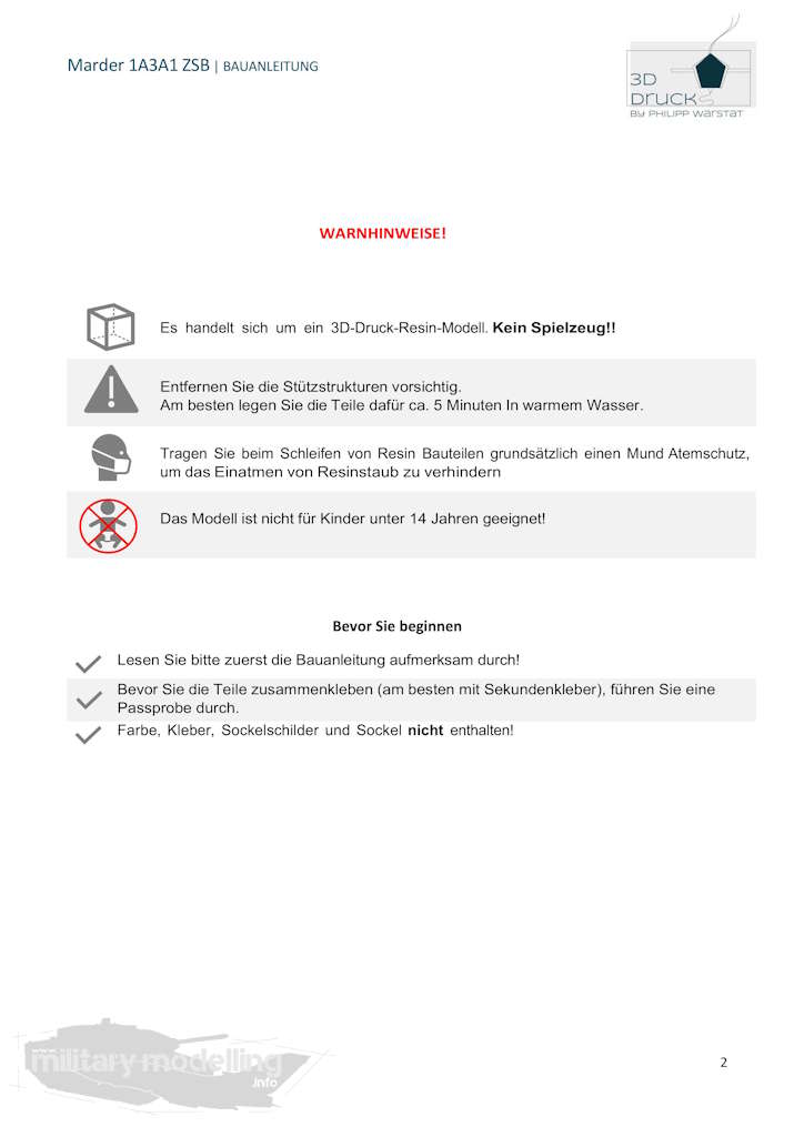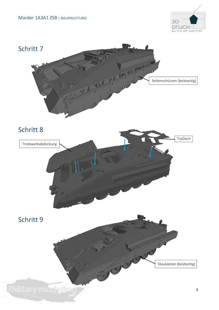 3D Druck P. Warstat liefert hier einen Multimix-Bausatz des Marder 1A3A1. Er besteht aus 3D-Druck-Resin-Bauteilen sowie Messingdrehteilen. Die Details sind hervorragend und stimmig. Die Bauteile stehen dem Original in nichts nach. Der Konstrukteur hat hier ganze Arbeit geleistet. Die Anleitung stimmig, ausführlich und verständlich. Der Druck der Bauteile ist hervorragend! Hier könnte sich so mancher 3D-Druck-Modell-Hersteller mal ein Beispiel nehmen.