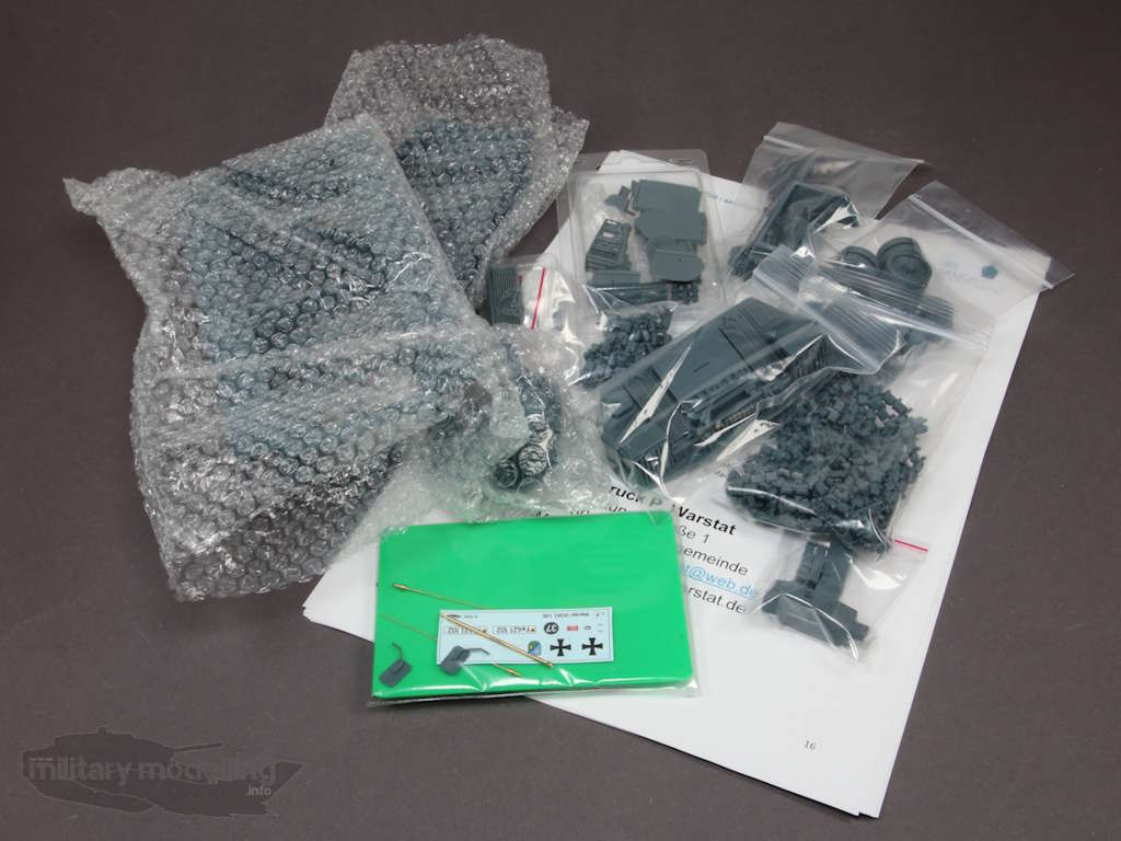 In einem mächtigen weißen Karton mit aufgeklebtem Label kommt der Bausatz mit der Artikelnummer BWM010 von 3D-Druck P. Warstat daher. Darin fein säuberlich in Luftpolsterfolie und Packmaterial verpackt die Bauteile aus Druck-Resin sowie Decals, Metallteile und die Bauanleitung. Verspricht schonmal viel Spaß.
