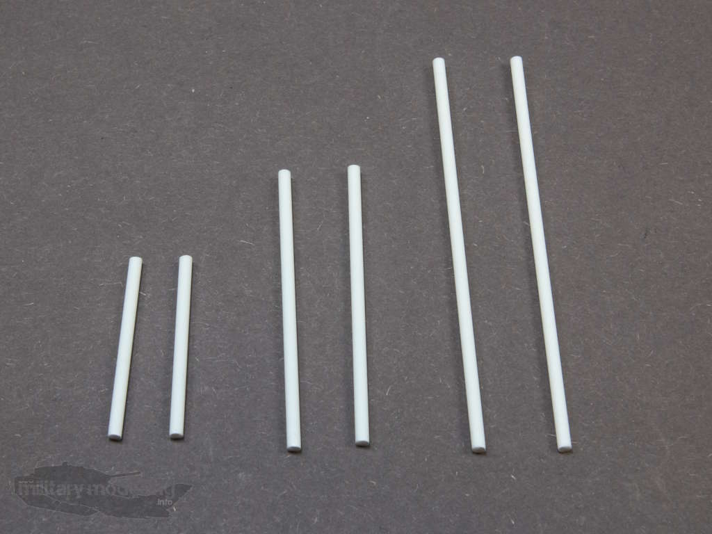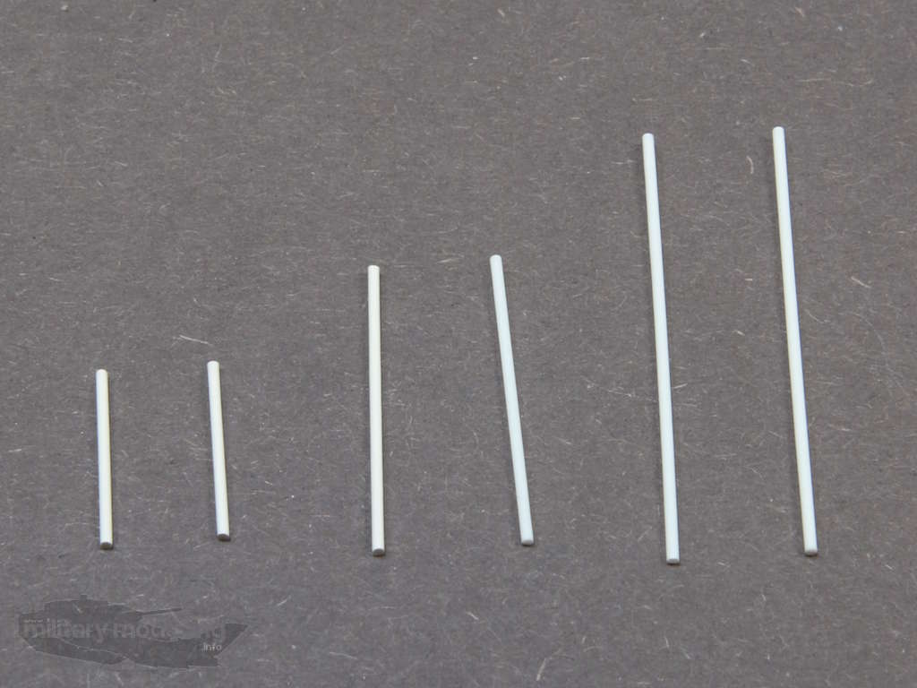 Die Haltestangen auch hier in maßstabsgerecht in 3 Längen – 37mm, 25mm und 15mm – bei 1mm Durchmesser als Kunststoffprofile.