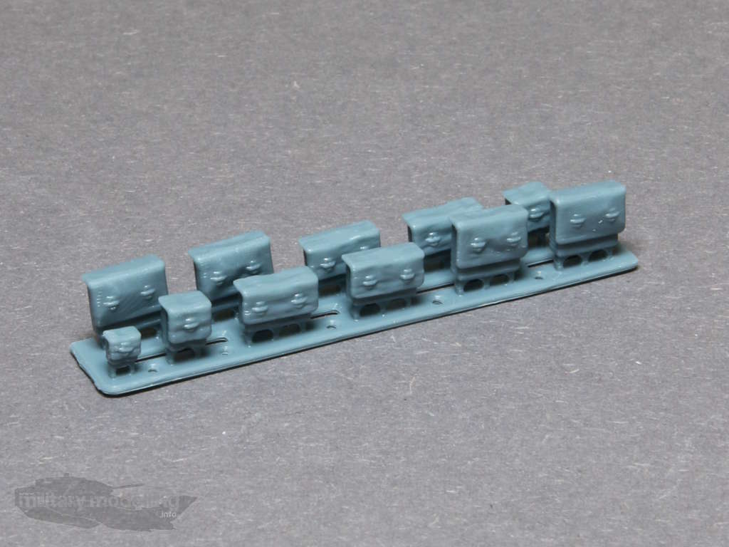 Auf einem Support sind die 28 enthaltenen Bauteile aus dunkelgrauem Resin verteilt.