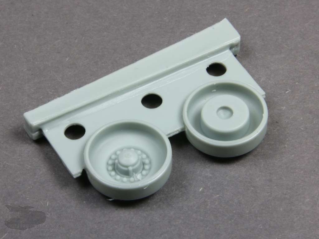 Die kleineren Leiträder kommen als Resin-Guss-Teile daher und befinden sich auf einem Anguss. Die Dimensionen sind stimmig und die Details wie z.B. die Nabenschrauben überzeugen. Etwas ärgerlich ist allerdings der über die Hälfte der Lauffläche fassende Anguss. Versäubern und schleifen ist hier angesagt.