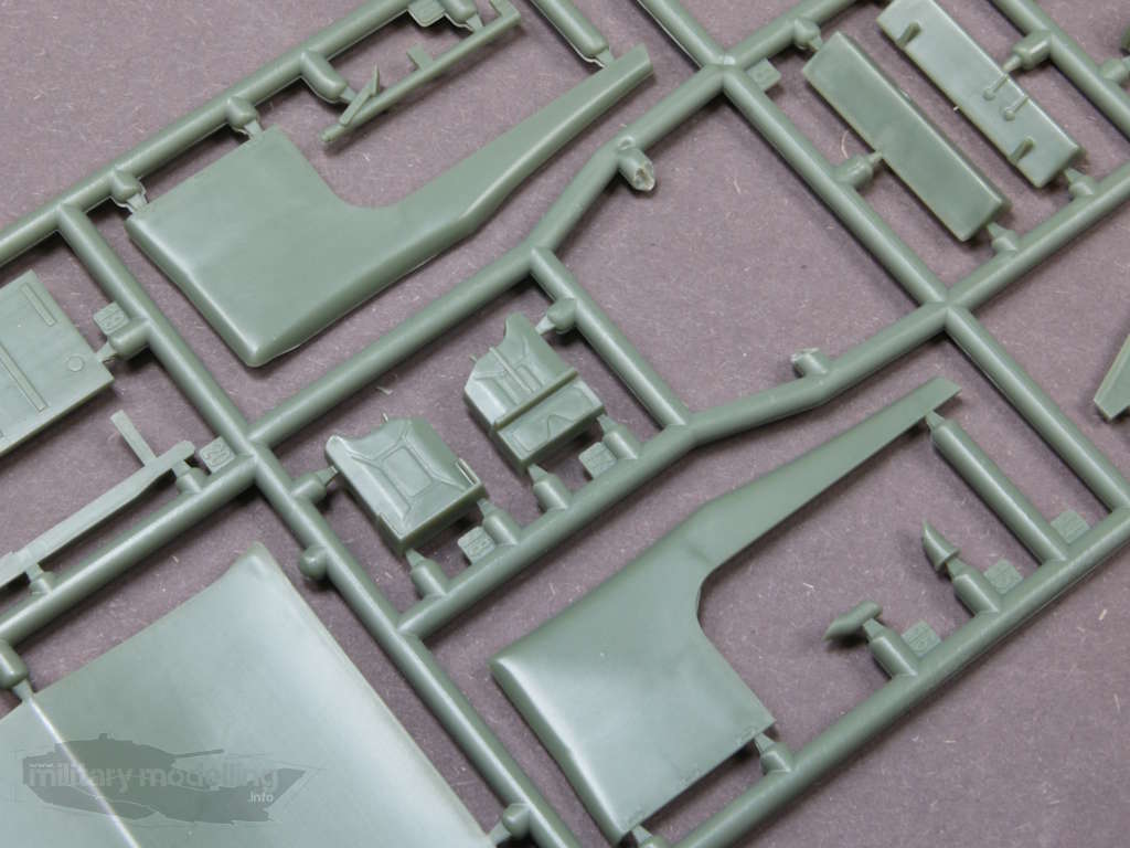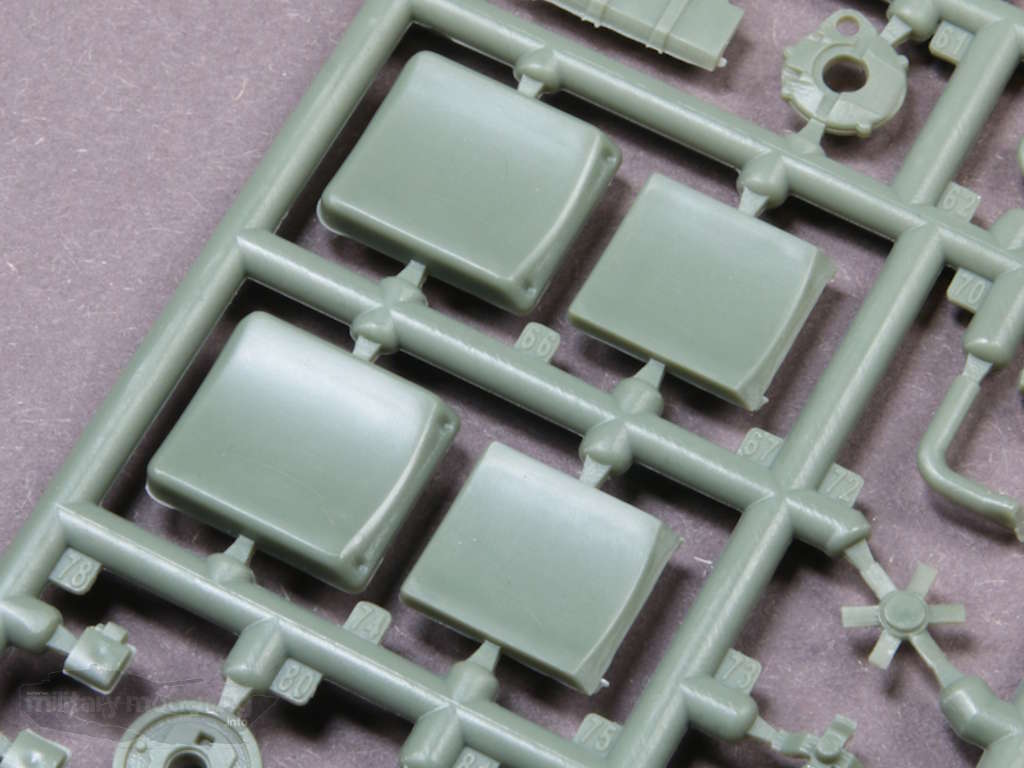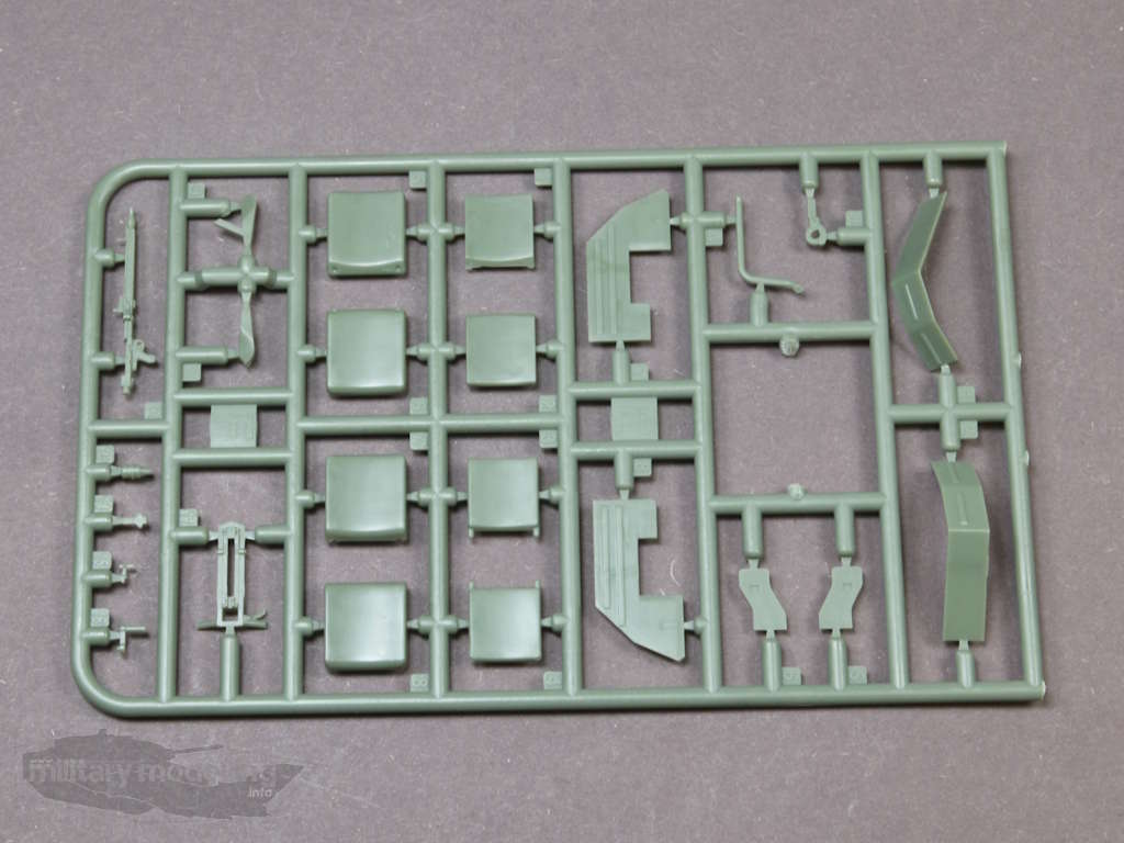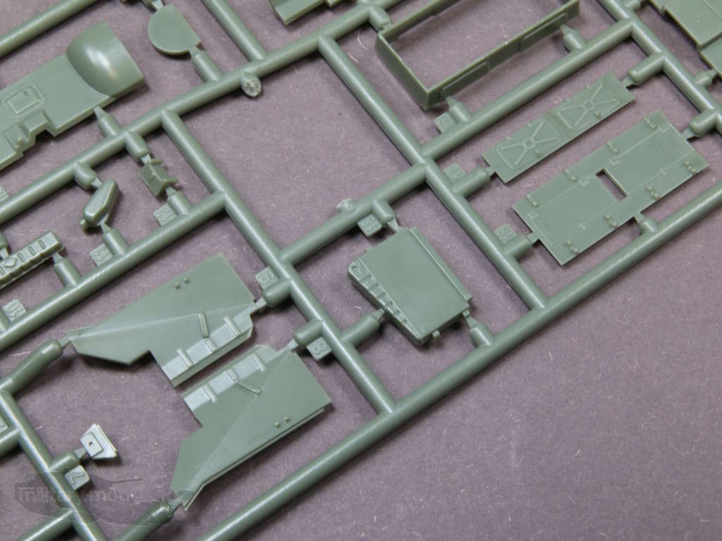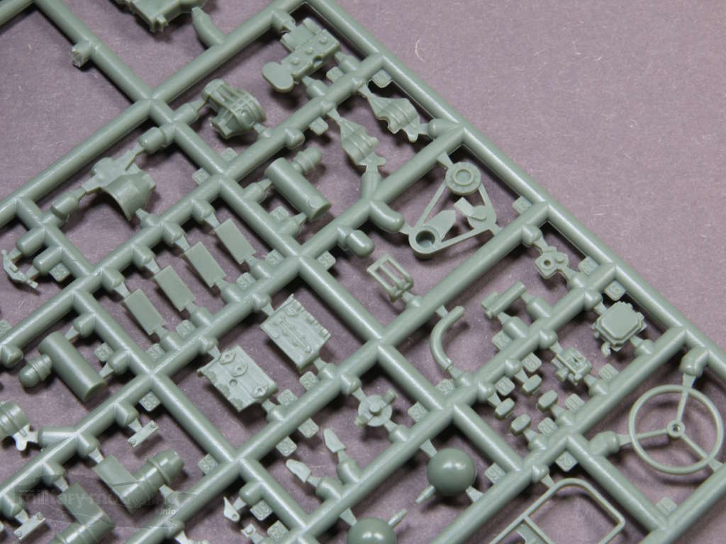 Die Felgen der Räder sowie Interieur wie Sitze, Lenkrad sind auf diesem Gussast zu finden. Dazu die vielen kleinen Bauteile des gut dargestellten Motors mit Getriebe sowie die Scheinwerfergehäuse und das vordere Schutzgitter.