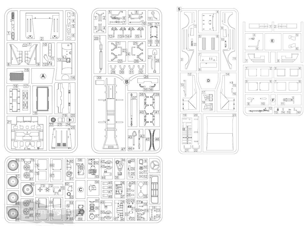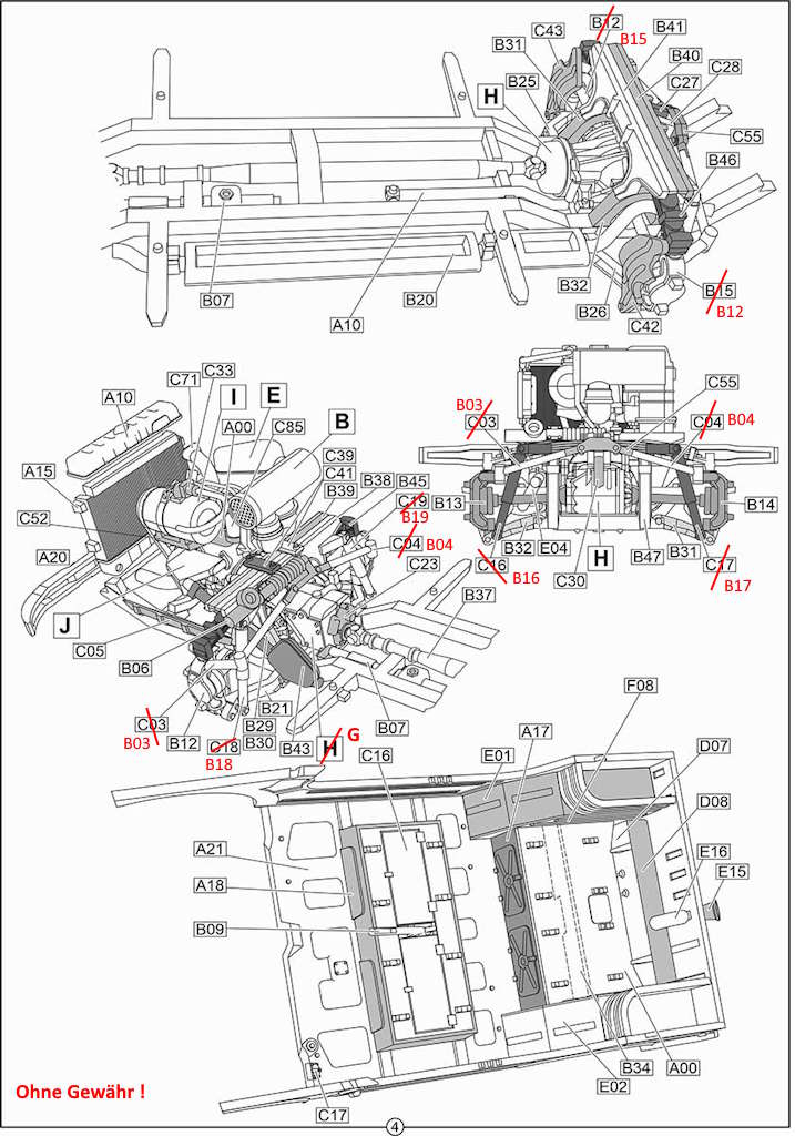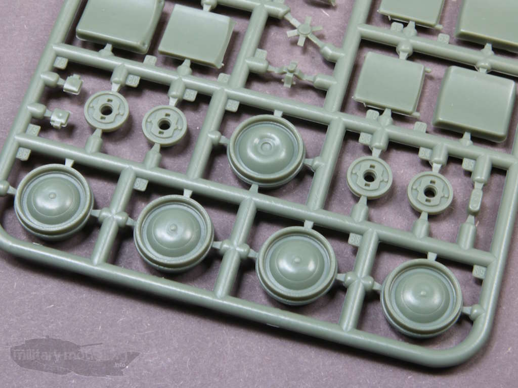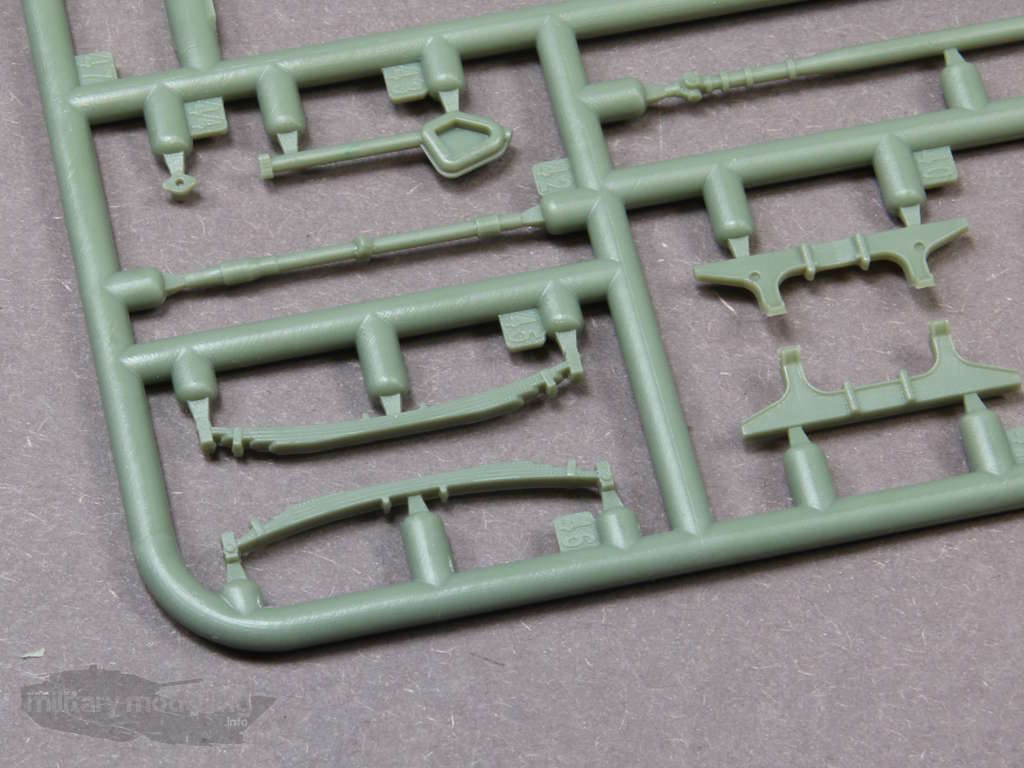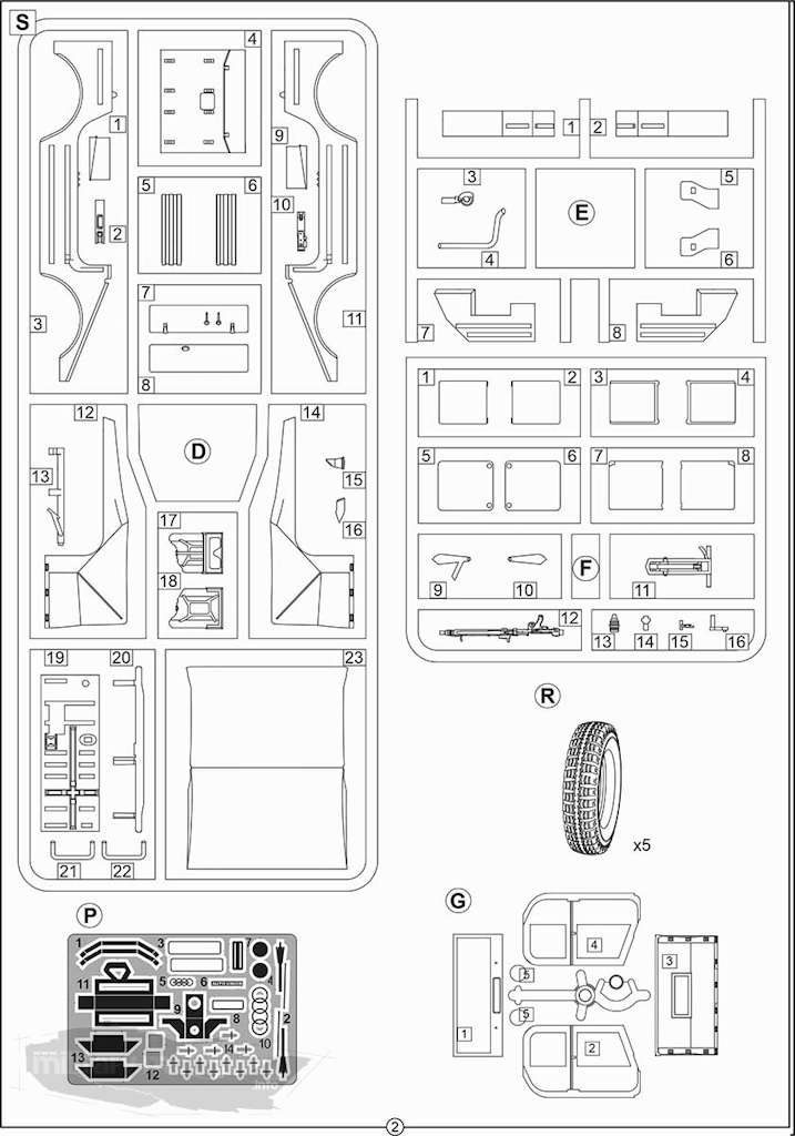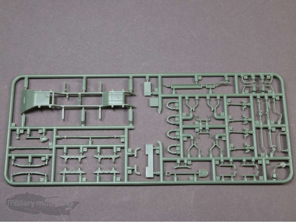 Die Felgen der Räder sowie Interieur wie Sitze, Lenkrad sind auf diesem Gussast zu finden. Dazu die vielen kleinen Bauteile des gut dargestellten Motors mit Getriebe sowie die Scheinwerfergehäuse und das vordere Schutzgitter.