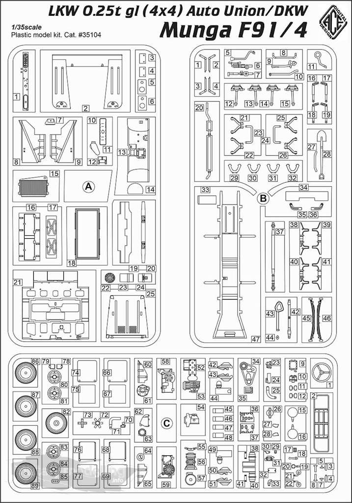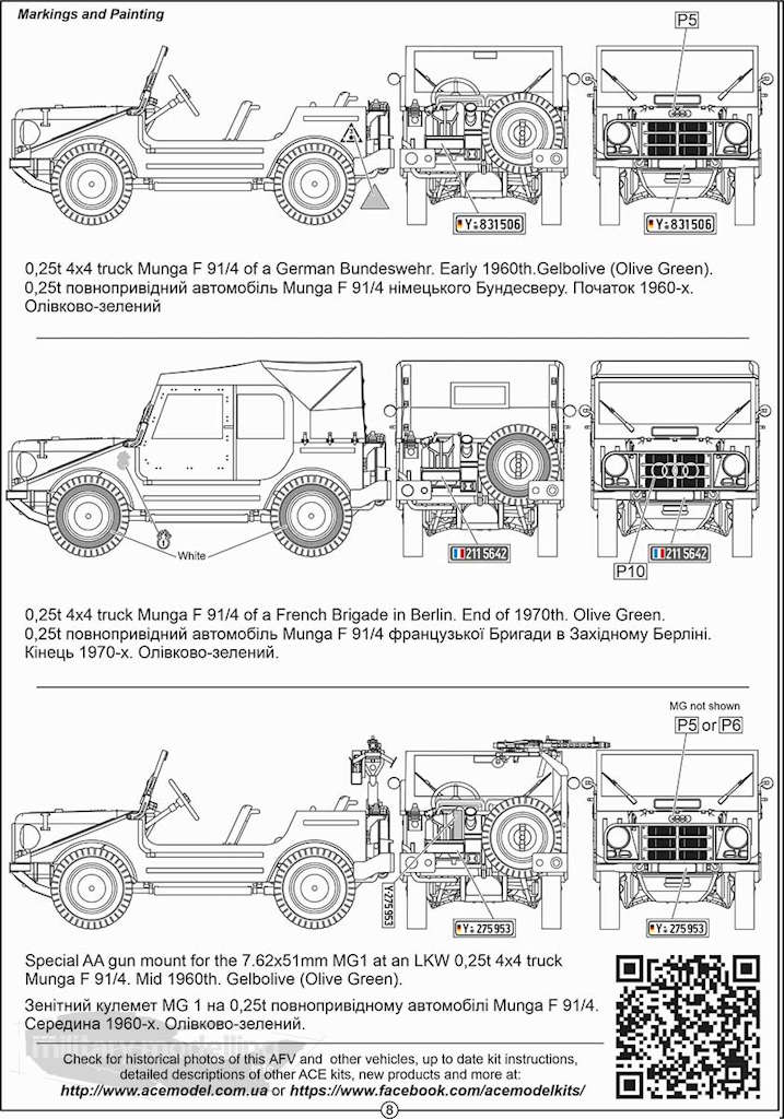Der 0,25t 4×4 Truck Munga F 91/4 von ACE Model ist ein interessanter Bausatz eines Fahrzeuges aus der gelboliven Epoche. Auf 5+1 Spritzlingen sind die teils sehr filigranen Bauteile enthalten. Die Fotoätzteile sind sinnvoll und detailliert gemacht und werten an richtiger Stelle auf. Die Anleitung ist leider die Archillesferse des Bausatzes. Sie überzeugt nicht. Die möglichen 3 Decalvarianten erfreuen. Der Bau des Modells nach meiner Ansicht schon eine gewisse Modellbau-Erfahrung voraus. Ein gelungener Bausatz eines frühen Klassikers im Maßstab 1:35 von ACE Model.