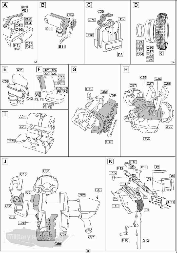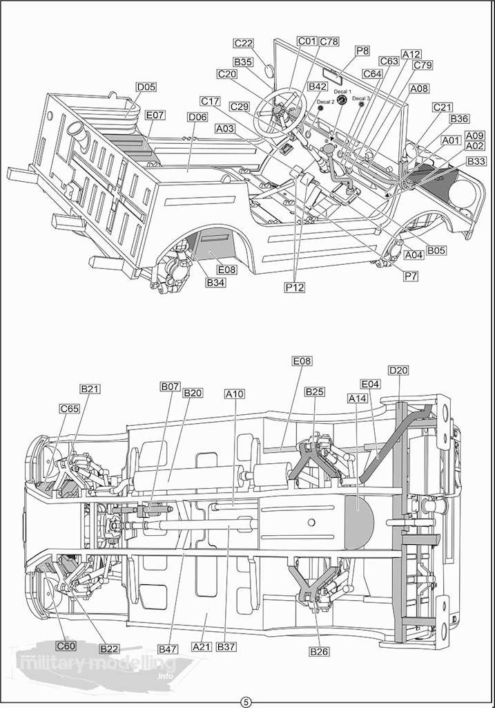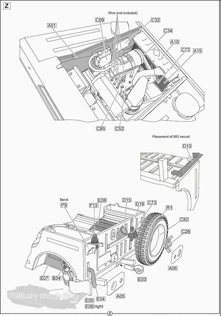 Die Bauanleitung im Format eines Booklets im A4-Format ist monochrom. Auf 8 Seiten führt sie meist mit ca. 18 Baustufen, meist aber leider nicht durchgängig mit Buchstaben bezeichnet, durch den Bau. Auf der ersten beiden Seiten die übersichtliche Bauteilübersicht mit Bauteilnummerierungen. Die Baustufen, welche als 3D-Explosionszeichnungen dargestellt sind, sind anfangs verständlich und übersichtlich werden dann aber überladen und unübersichtlich. Auf der letzten Seite sind 3 Markierungs- und Farbvarianten einfarbig abgedruckt. Dazu zählen eine französische Variante sowie zwei gelbolive Varianten der Bundeswehr. Baubar ist der Munga mit oder optional ohne Verdeck.