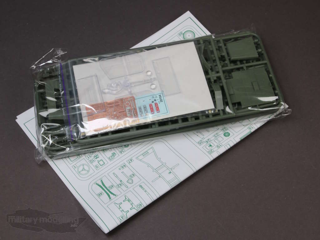 Der Bausatz des 0,25t 4×4 Truck Munga F 91/4 von ACE Model mit der Artikelnummer 35104 wird, wie bereits von ACE Model bekannt, in einem kleinen, fein gestalteten Stülpkarton geliefert. Darin befinden sich in Folie verpackt 5 hellolive Spritzlinge, 1 Spritzling mit Klarsichtteilen. Zusätzlich in einem Druckverschlussbeutel verpackt eine Fotoätzteilplatine, Reifen aus Vinyl, Decals sowie die einfarbige Bauanleitung.