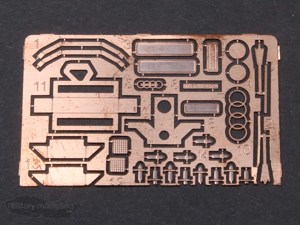 Im Bausatz enthalten ist eine Ätzteilplatine aus dem bereits von ACE Model bekannten relativ dünnem Kupferblech. Die Ätzung der Platine ist gut. Mein Exemplar wurde, wie zu sehen, etwas knapp gekürzt. Auf der Platine z.B. Scheibenwischer, Fahrzeug-Hersteller-Logo, Planenverschlüsse, Kennzeichenhalter und Halterungen.