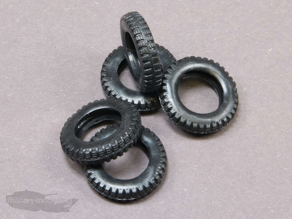 Die Reifen des 0,25t 4×4 Truck Munga F 91/4 Bausatzes sind aus Vinyl hergestellt. Enthalten sind 5 Reifen einschließlich des Ersatzrades des Fahrzeuges. Das Profil der Reifen ist gut dargestellt. Leider fehlen die Flankenbeschriftungen komplett. Hier hoffen wir mal auf den Zubehörmarkt.