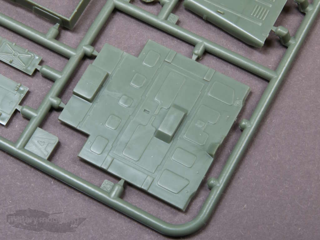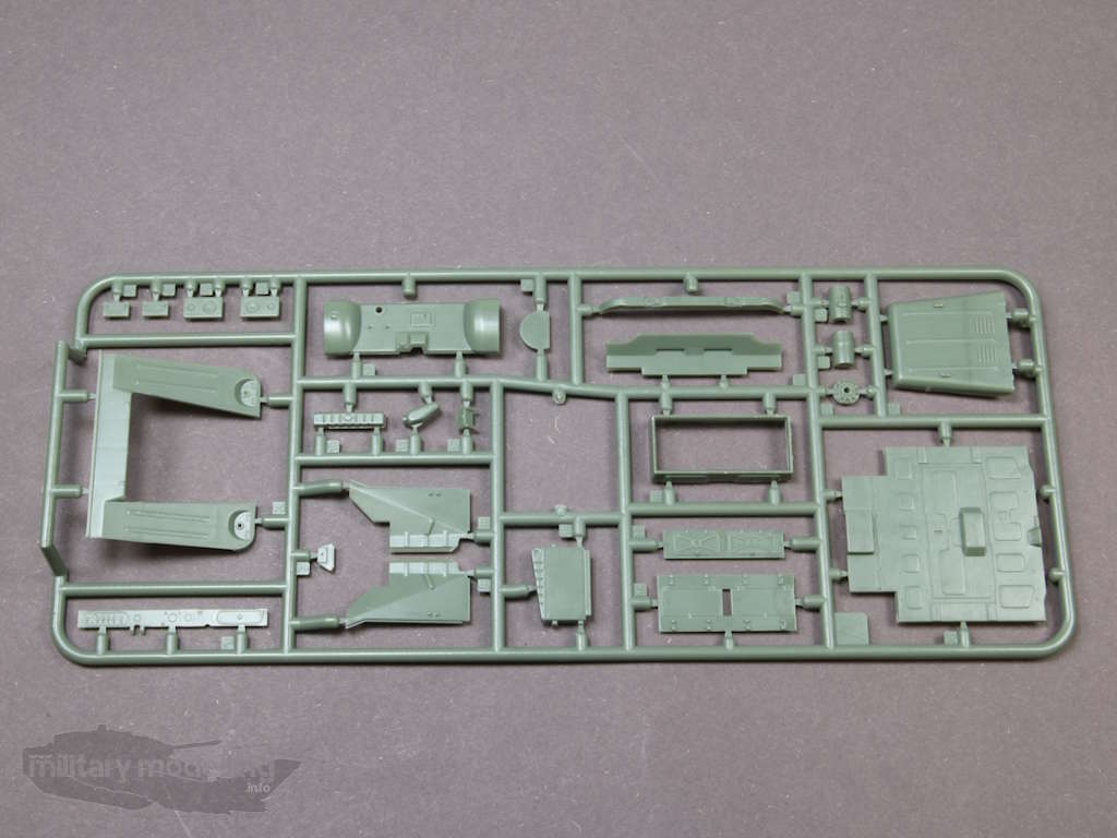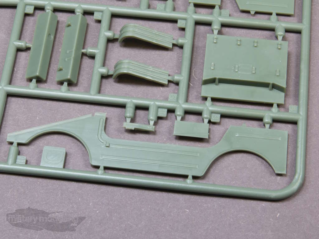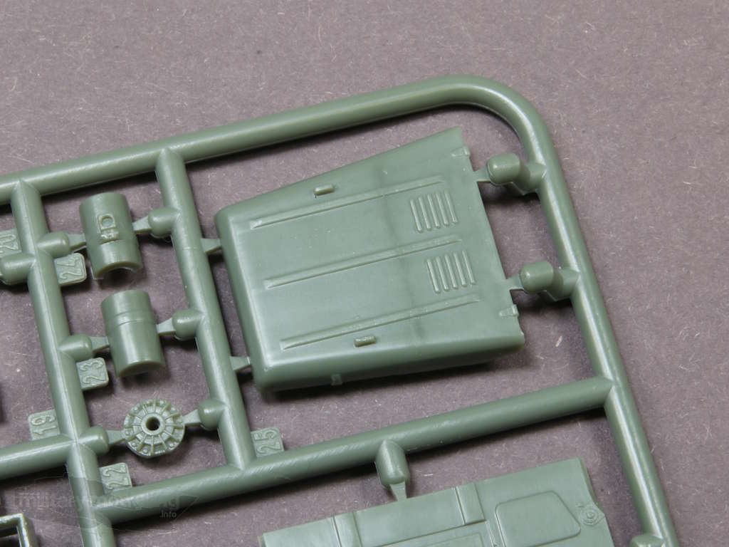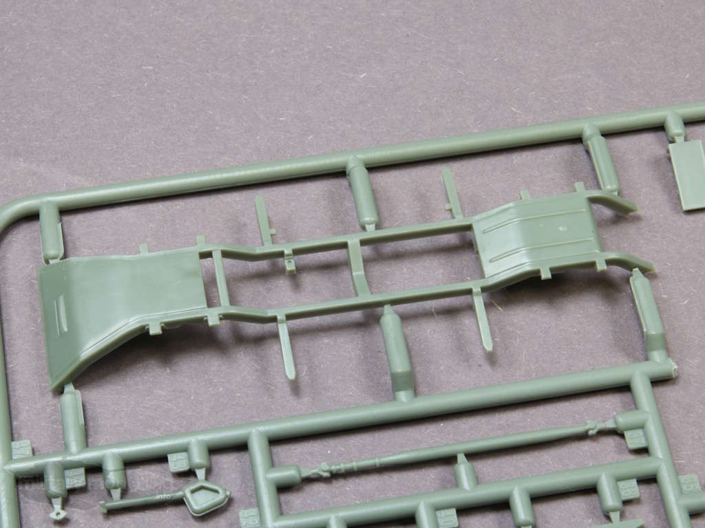 Auf dem Spritzling A finden wir hauptsächlich Bauteile der Karosserie wie z.B. Boden, Front Haube. Aber auch das Armaturenbrett, der Kühler und die Stoßstange sind hier zu finden. Alle Bauteile zeigen eine gute Detailtiefe.
