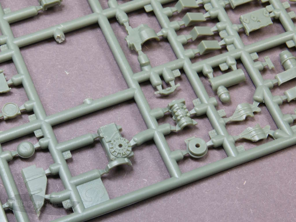 Der Spritzguss ist als gut zu bezeichnen, sieht aber nicht so scharf aus. Eine Vielzahl der Bauteile ist sehr kleinteilig. Bei dem Bausatz handelt es sich definitiv um keinen Bausatz für Anfänger. Schauen wir uns die Bauteile auf den enthaltenen Spritzlingen also mal näher an.