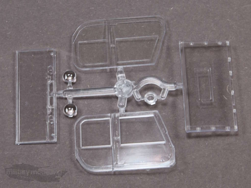Bei diesem Spritzling handelt es sich um den Gussast auf dem die Klarsichtteile vorhanden sind. Seitenscheiben, Frontscheibe und Heckscheibe sind hier enthalten. Bei den Seiten- und der Heckscheibe ist der Anteil an Verdeck enthalten. Daher muss der Modellbauer bei Verwendung dieser die Scheiben vor dem Lackieren abkleben.