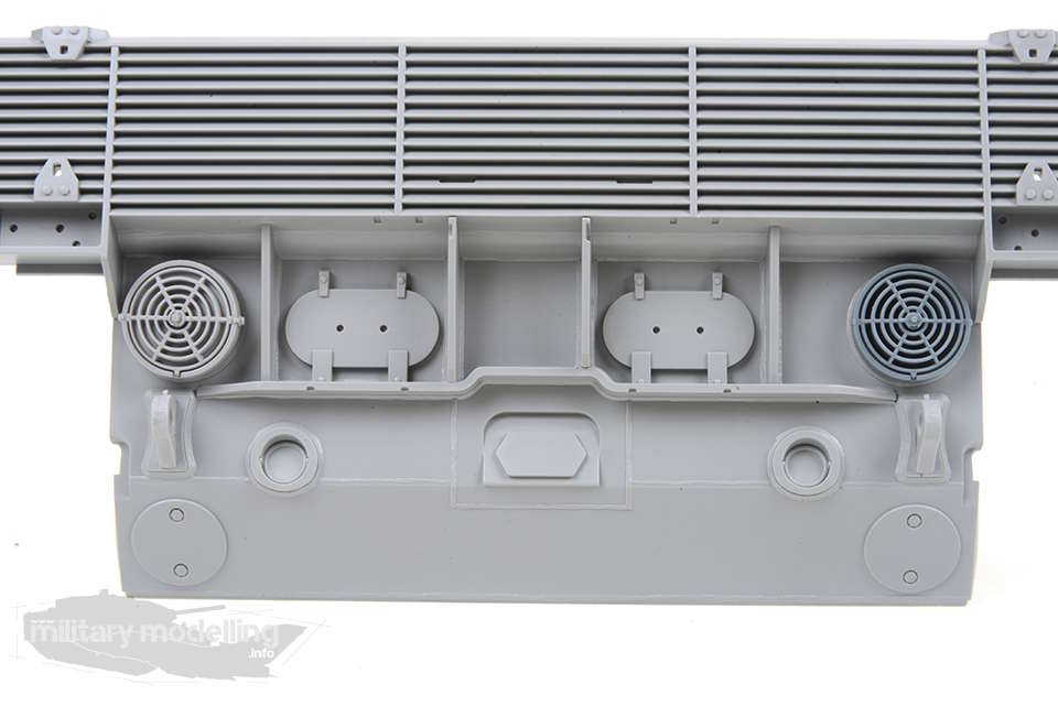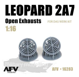 Die Abdeckungen des Auspuffs eines Leopard 2 Triebwerks sind gut zu sehen. So natürlich auch beim 1:16-Modell von Das Werk. AFV Modeller bietet mit seinen Open Exhausts eine 3D-Druck-Variante für den Bausatz an. Schauen wir mal…