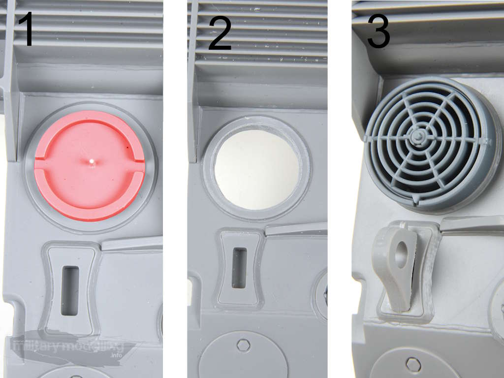 Zum Einbau der Gitter müssen am Bauteil des Wannenhecks die passenden Öffnungen hergestellt werden. Dazu muss der im folgenden Bild dargestellte rote Teil entfernt und eine Kreisöffnung hergestellt werden. Dann können die 3D-Druck Bauteile eingesetzt werden.