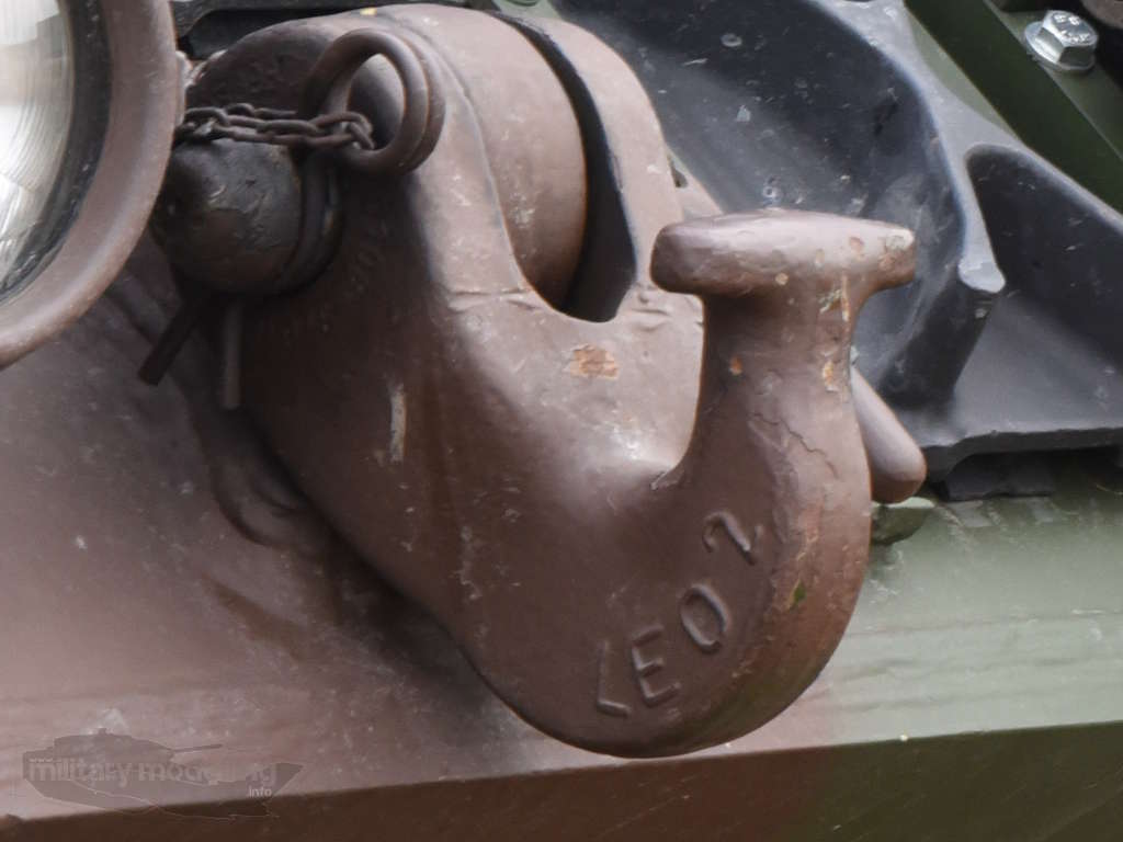 Die Schäkel des Leopard 2 sind recht markant am Heck und auf der Frontplatte angebracht. Sie sind abnehmbar und durch einen Bolzen mit der Wanne verbunden. Der Bolzen wird mit einem Splint gesichert. Die Hinteren Schäkel dienen gleichzeitig dazu die verstauten Abschleppseile zu halten. Dazu haben diese noch ein extra Blech, damit die Öse nicht aus dem Schäkel springen kann.