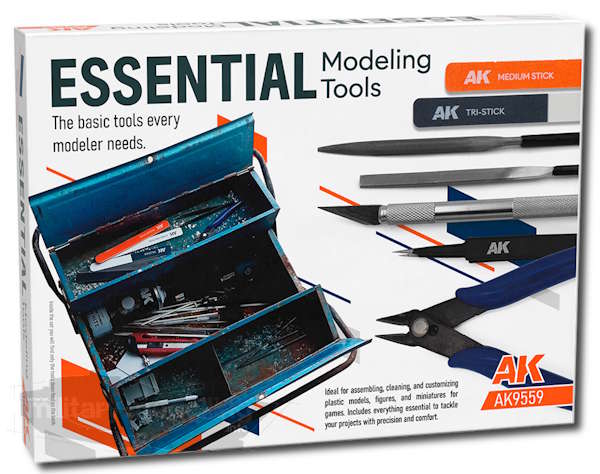 Im fein gestalteten Karton kommt das Essential Modeling Tools Set von AK Interactive mit der Artikelnummer 9559 daher. Darin befinden sich in einem Blister die einzeln verpackten grundlegenden Werkzeuge für den Modellbau aus dem Portfolio von AK Interactive.