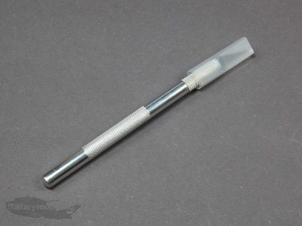 Das enthaltene Bastelmesser (Skalpell) mit der Artikelnummer AK9515 besteht aus einem gedrehten Aluminiumgriff mit diagonaler Klinge, die sich ideal für Präzisionsschnitte, Bohren, Schaben usw. eignet. Der Griff verspricht festen Halt und gute Kontrolle. Ersatzklingen sind leider nicht enthalten.