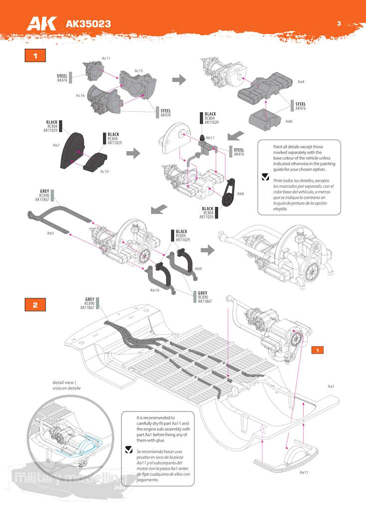 Die im DIN-A4 Format enthaltene Bauanleitung enthält 24 Seiten, in denen in 37 Baustufen durch den Bau geführt wird. Die Anleitung ist sehr übersichtlich und gut verständlich. Die enthaltene Farbtabelle beschränkt sich ausschließlich auf Farben aus dem Hause AK Interactive. Neben den Bauteilen sowie dessen Positionierung enthält diese in den Baustufen teilweise auch Farbangaben.