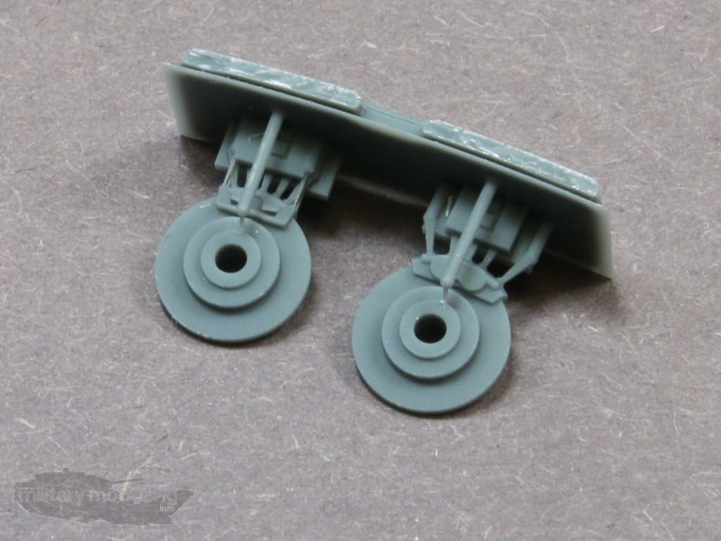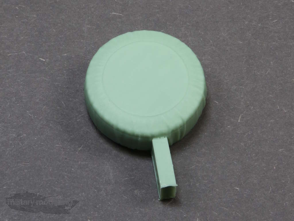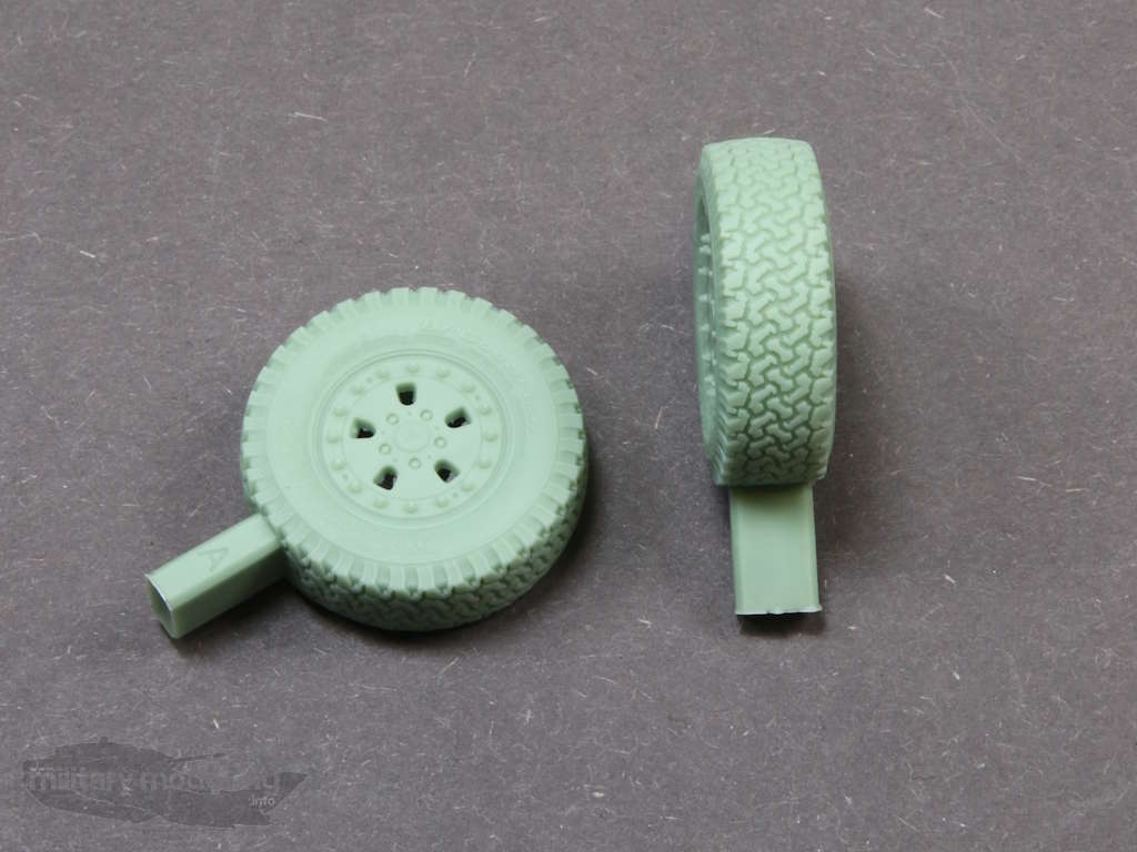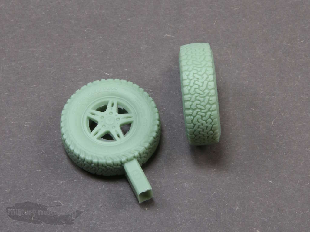 Enthalten sind 5 Räder mit Anguss aus Resin. Dies sind die 4 Räder für die Achsen und das Ersatzrad. Auf den Angüssen sind Buchstaben – A-B – eingeprägt. Der Hintergrund dieser Buchstaben ist die unterschiedlich positonierte Flankenbeschriftung gegenüber dem Anguss, was ein gewohnt schönes Detail ist.