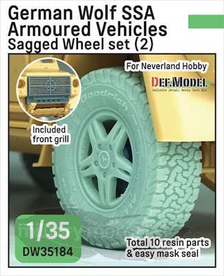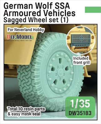 Artikelbezeichnung : German Wolf SSA Armoured Vehicles Sagged wheel set (1) Art. Nr. : DW35183 Artikelbezeichnung : German Wolf SSA Armoured Vehicles Sagged wheel set (2) Maßstab: 1:35 |