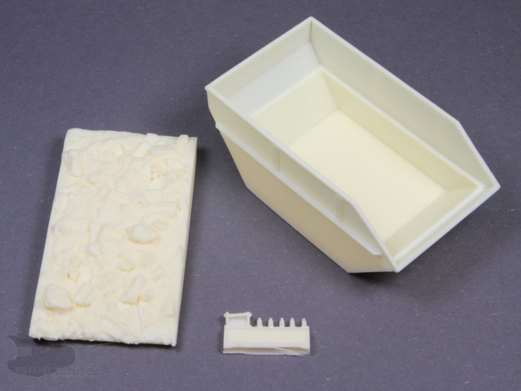 Der Bausatz der Schuttmulde enthält übersichtliche 8 Bauteile. Alle Bauteile zeigen einen tadellosen Guss.