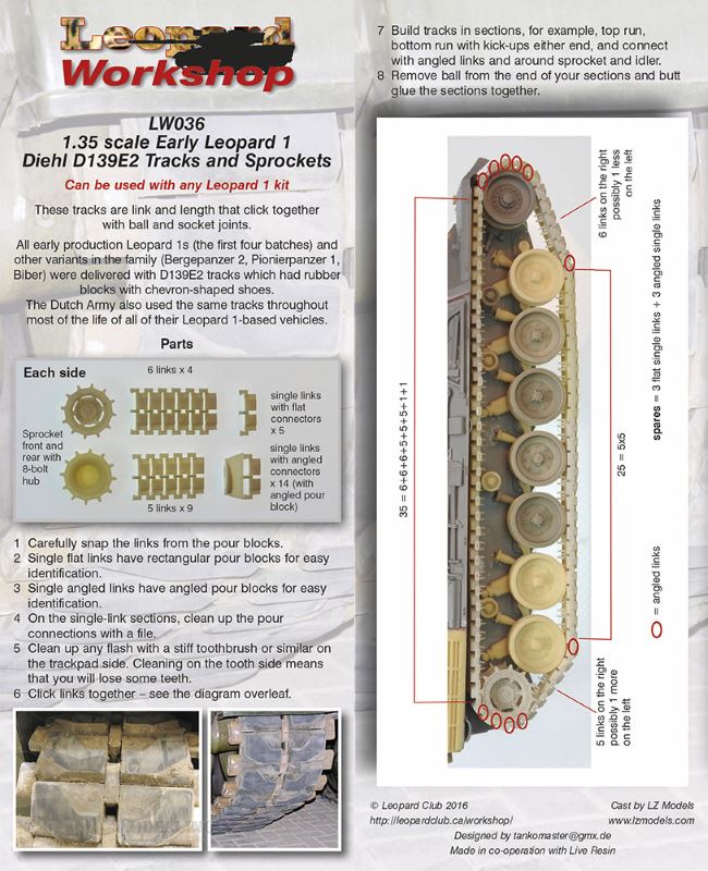 Artikelbezeichnung : Early Leopard 1 Diehl D139E2 Tracks and Sprockets Art. Nr. : LW036 Maßstab: 1:35 Bausatztyp: Zurüstset Basisbausatz: gängige Leopard 1 Bausätze aller Hersteller Material: Resin Hersteller: Leopard Workshop – http://www.leopardclub.ca Preis : ca. 24,- EUR |