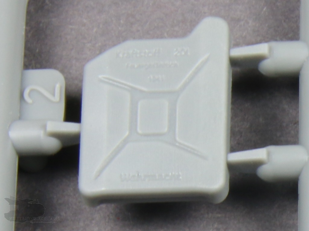 Auf den Spritzlingen befinden sich die zweiteiligen eckigen als auch dreieckigen Kanisterhälften, Verschlüsse und Tragegriffe. Alle Bauteile sind fein detailliert. Der Guss ist randscharf und die Anbindungen recht schmal und gut zu entfernen. Besonders gelungen finde ich die Beschriftung auf den Kanistern.