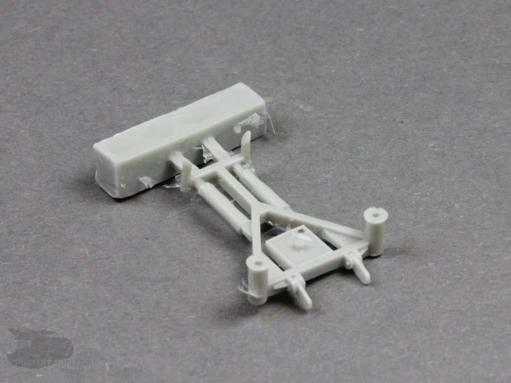 Das größte Bauteil im Bausatz macht die komplette Wanne mit Fahrwerk und Oberwanne aus. Dabei handelt es sich um einen massiven Resinklotz mit Anguss, dessen Guss aber einwandfrei ist. Alle Details sind bereits an der Ober- und Unterwanne enthalten. Dazu zählen z.B. Schneegreifer, Werkzeuge, Schäkel, Umlenkrolle, Werkzeugkiste, Außen-BV-Anlage, Stoßdämpfer, Laufradschwingen und Abschleppseile. Nichts wirkt hier verwaschen. Alles ist randscharf. Auch die korrekten, eingelassenen Abgasgrätings sind absolut gelungen. Eine echte Augenweide.