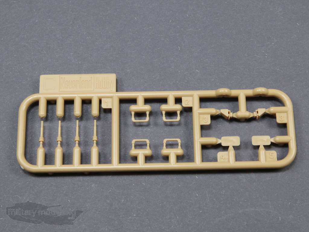 Auf diesem, letzten, Spritzling finden sich die Bauteile für den Rahmen des Wolf SSA. Der Rahmen ist zwar mehrteilig ausgebildet, aber der Grundrahmen einteilig. Das ist prima, spart man sich so das lästige und meist schiefe Ausrichten der Einzelteile. Die Aussenseiten der zweiteiligen Felgen findet sich ebenfalls hier. Auch hier überzeugt Neverland Hobby mit Vorbildtreue.