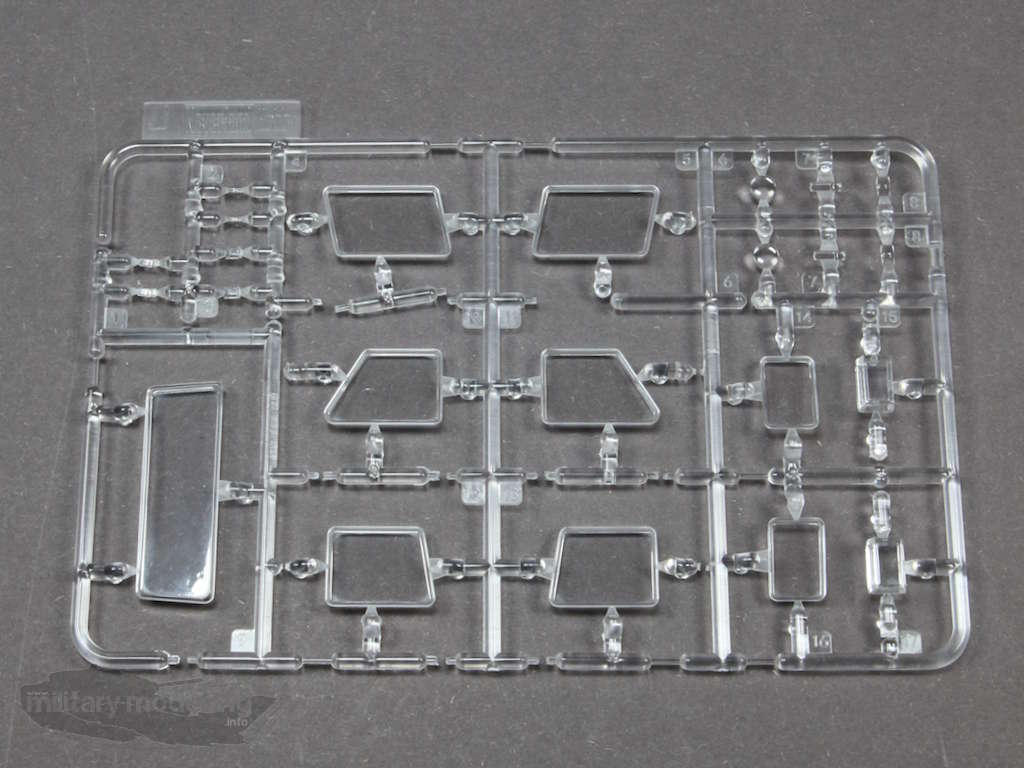 Beim Spritzling J handelt es sich um den klaren Spritzling. Enthalten sind hier alle Fensterscheiben, Scheiwerfergläser sowie die Hauben der Rundumleuchten. Alles ist sehr gut klar gespritzt. Interessant ist, dass die Scheiben von außen verklebt werden. Vorbildlich, die enthaltenen bereits erwähnten Abklebemasken für die spätere Lackierung.