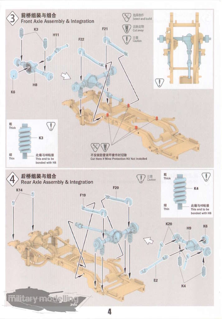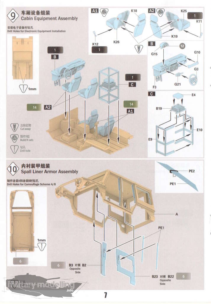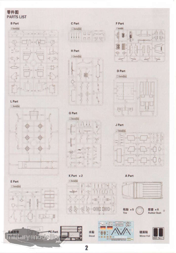 Die Bauanleitung im Format eines Booklets im A5-Format ist durchweg in Farbe gehalten. Auf 15 Seiten führt sie mit 23 Baustufen durch den Bau. Auf der ersten beiden Seiten die allgemeinen Hinweise sowie die Übersicht über die enthaltenen Bauteile / Spritzlinge. Die Baustufen welche als 3D-Explosionszeichnungen dargestellt sind, sind verständlich und sehr übersichtlich. Die zu verbauenden Bauteile nicht stets farbig markiert, was eine Positionierung erleichtert. Die möglichen Bauvarianten – 3 an der Zahl – sind mit A, B, C im Verlauf der Baustufen gekennzeichnet. Weitere Hinweise in Text- und Bildform erleichtern hier den Bau. Hier muss sich der Modellbauer also für eine Variante entscheiden.