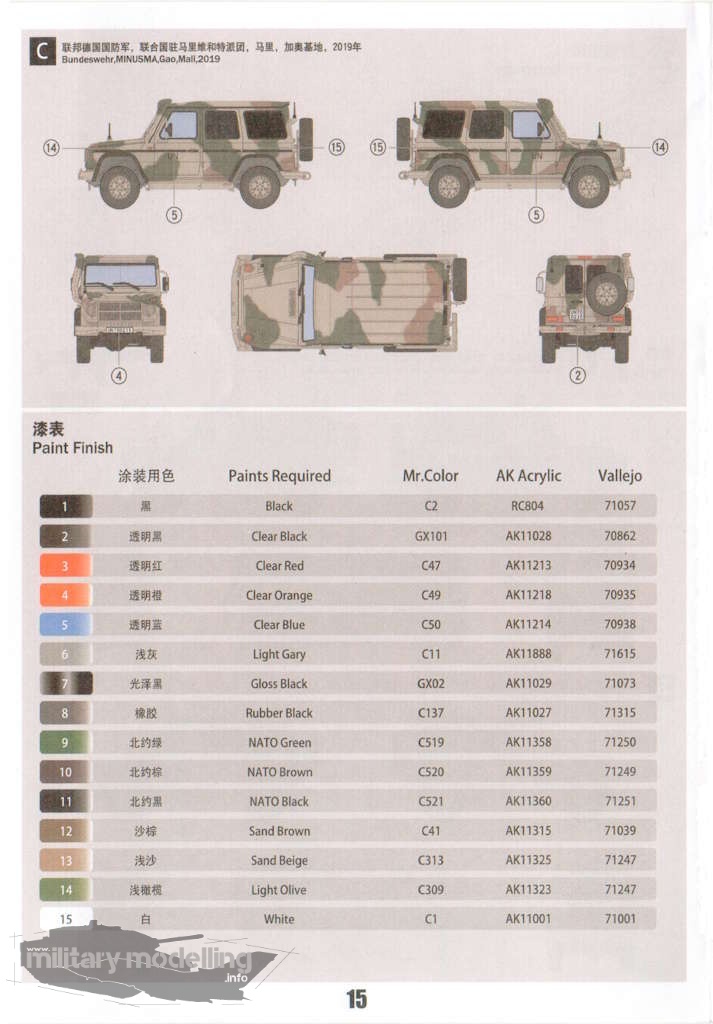 Auf den letzten beiden Seiten sind die 3 möglichen Markierungs- und Farbvarianten farbig abgedruckt. Dazu zählen eine Variante im Nato-3-Farb, sowie zwei Varianten in Umtarnfarben. Weiterhin enthält die Anleitung eine Farbtabelle mit Farbvorschlägen von Mr. Color, AK Acrylic und Vallejo.