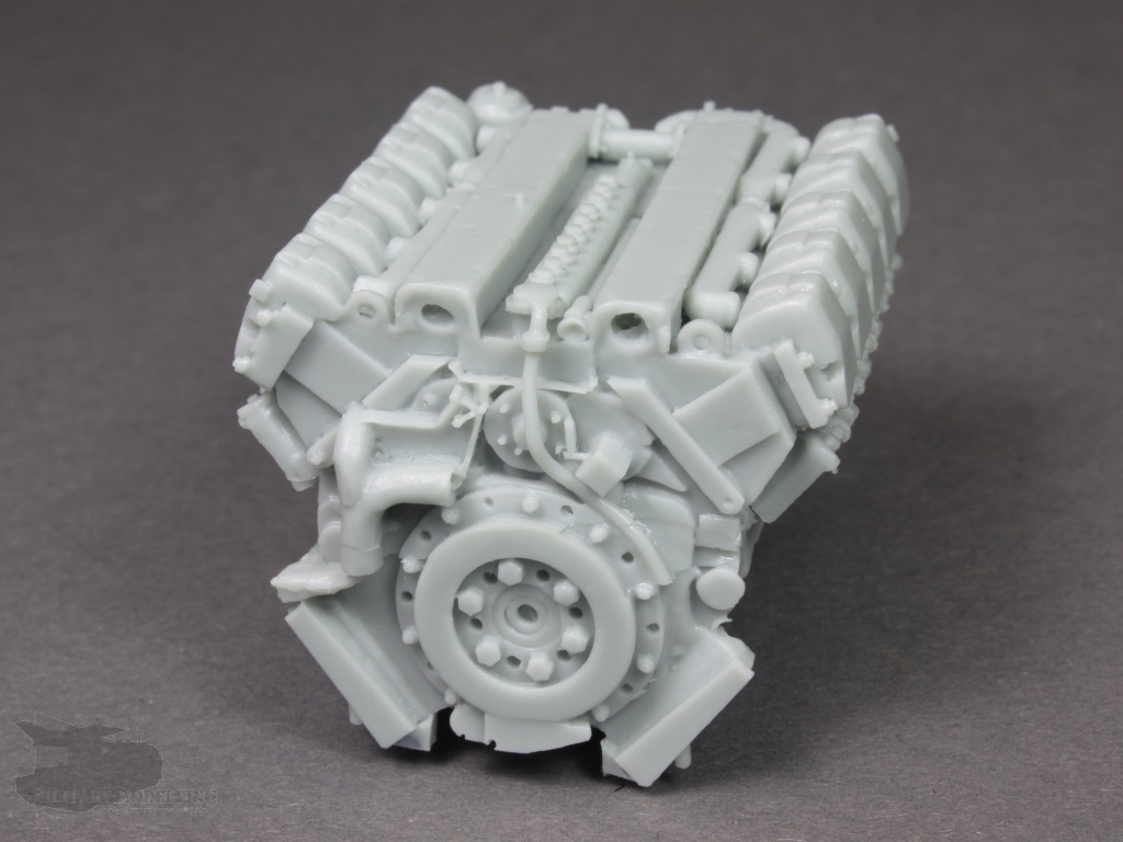 An der Hauptblock sind Ölbehälter, Lichtmaschine, Kompressoren, Ölfilter, Kühlmittelpumpe, Auspuff, Steuerleitungen, Kühlmittel-Ausgleichsbehälter, der Öleinfüllstutzen und der Ölmessstab sehr schön wiedergegeben. Fotogeätzte Trittplatten runden den Motor nach oben hin ab. Auffallend ist, dass es in der Bauanleitung nicht genau ersichtlich ist, wie die Baugruppen miteinander verbunden werden. Weiterhin zeigt die Anleitung Leitungen und Schläuche, welche nicht enthalten sind. Hier wäre wohl Bleidraht eine sinnvolle Alternative. Nach dem Zusammenbau zeigt sich ein fantastisches Modell.