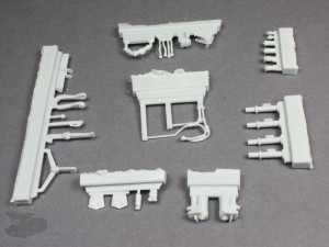Die Baugruppe des Triebwerkblockes besteht, wie bereits erwähnt, aus dem Getriebe mit Motorblock und Kühlsystem. Motorblock und Getriebe bilden gleichzeitig die größten Bauteile des Bausatzes. Jeweils an einem Anguss befestigt sind diese großen „Blöcke“ ausgesprochen detailliert. Der Guss ist erstklassig und lässt keine Mängel erkennen.