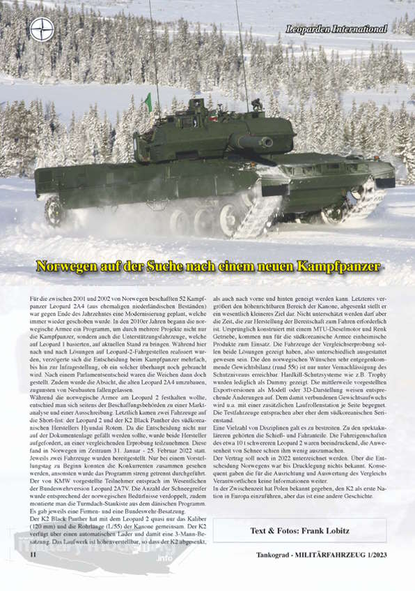 Die Ausgabe beginnt diesmal mit der „Zukunft der MILITÄRFAHRZEUG“ des Chefredakteurs an seine Leser. Die gute Nachricht, es geht auch 2023 weiter mit der MILITÄRFAHRZEUG – aber anders. Die MILITÄRFAHRZEUG wird nicht mehr als Quartalszeitschrift angeboten, sondern als Reihe. D.h. wenn der Verlag eine inhaltlich hochwertige Publikation im akzeptablen Umfang (64+ Seiten) zur Verfügung stellen kann wird es eine Ausgabe geben. Aktuell plant der Verlag mit zwei Ausgaben für 2023. Eine im Frühjahr/Sommer und eine im Herbst/Winter.