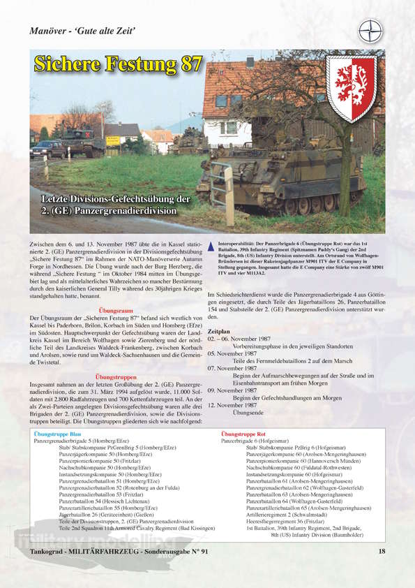 Unter der Rubrik Manöver – „Gute alte Zeit“ nimmt uns Walter Böhm mit zur letzten Divisions-Gefechtsübung der 2. (GE) Panzergrenadierdivision „Sichere Festung“. Er informiert über Übungsraum und -teilnehmer, Übungslage, Aufmarsch, Gefechtsphase und fasst die Übung zusammen. Dazu zahlreiche, schöne historische Farb-Aufnahmen.