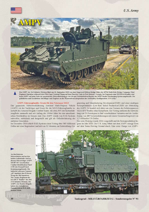 Einen technischen Überblick erhält man anschließend über den AMPV, den Ersatz für den Veteranen M113 der U.S. Army. Walter Böhm stellt fünf AMPV-Varianten vor und geht auf Konfiguration, Schutz und Mobilität ein. Passende Fotos fehlen natürlich nicht.