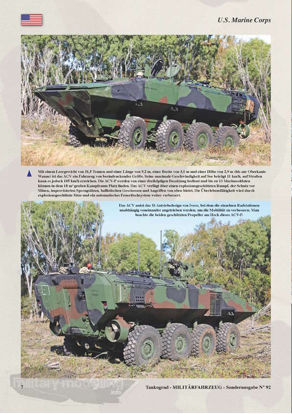 Im ersten Artikel der Ausgabe steht der ACV (Amphibious Combat Vehicle), das neue „Schlachtschiff“ der US Marineinfantrie. Der Autor Gordon Arthur beschreibt hier die Teilnahme an der Übung Talisman Sabre 2025 sowie die Entwicklung, Beschaffung und Varianten des ACV. Weiterhin geht er auf Optionen zur Nutzung sowie ausländische Kunden ein. Dazu zahlreiche Farbaufnahmen des Fahrzeuges mit weiteren Informationen in den Bildunterschriften.