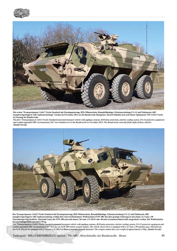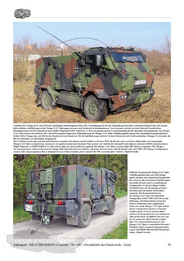 Der aktuelle Band 5102 von Tankograd Publishing führt mit einem langen Textteil in die Systeme und Fahrzeuge der ABC-Abwehrkräfte der Bundeswehr ein. Es folgt anschließend ein großer Bildteil, wo die Fahrzeuge und Systeme vorgestellt werden. Viel Information und reichlich Farbfotos zeichnen diese Ausgabe aus.
