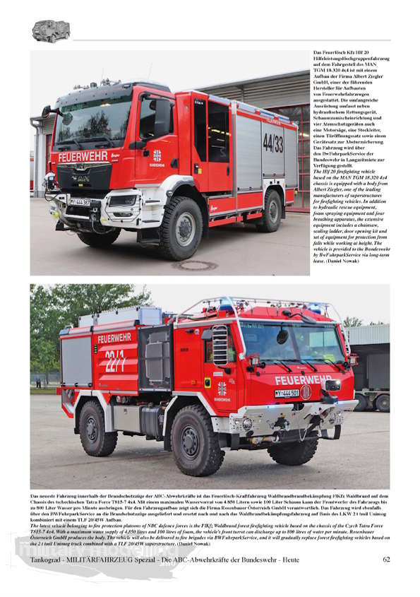 Dem Brandschutz ist das letzte Kapitel der Ausgabe gewidmet. Hier werden die Fahrzeuge ELW 1, FklKfz 1000, Waldbrandbekämpfungsfahrzeug LKW 2t, FlKfz Geräterüst BW, FlKfz Hlf 20, FlKfz Tatra T815-7 4×4 sowie die Faun FlKfz 3500 vorgestellt und in den Bildunterschriften beschrieben.