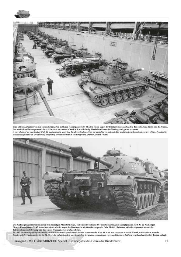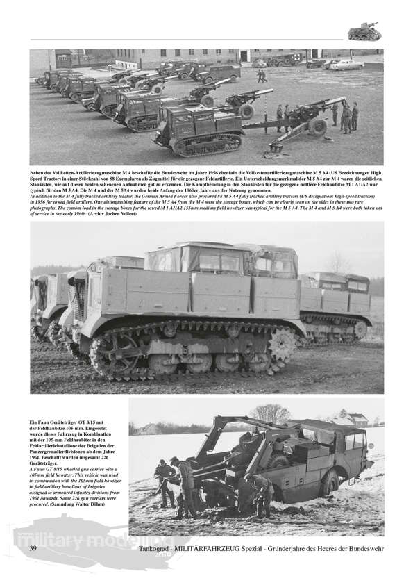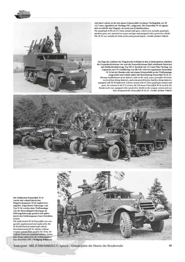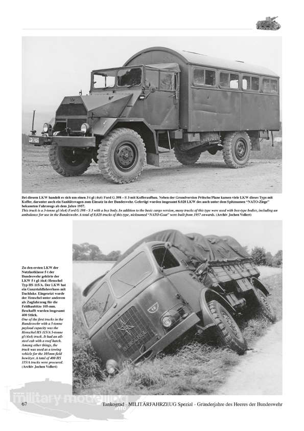 Der aktuelle Band von Tankograd Publishing geht auf die erste Dekade der Wiederbewaffnung, 1956-65 ein, welche fahrzeugtechnisch unter „US Panzerfahrzeuge und deutsche Lastkraftwagen” zusammengefasst werden kann. Beginnend mit der Heeresstruktur 1 und 2 zeigt die Publikation ausgesuchte und bisher meist unveröffentlichte Fotos der legendären deutschen LKW der Hersteller Borgward, Mercedes-Benz, Daimler-Benz, Faun, Porsche, Auto-Union/DKW, Henschel, Magirus-Deutz, MAN, dazu die Panzerfahrzeuge aus US-Produktion wie M7, M16, M39, M41, M42, M44, M47, M48, M55, M74, M88, M113 und andere. Nicht fehlen dürfen natürlich Fahrzeuge wie beispielsweise der Bren Gun Carrier oder der Schützenpanzer HS 30.
