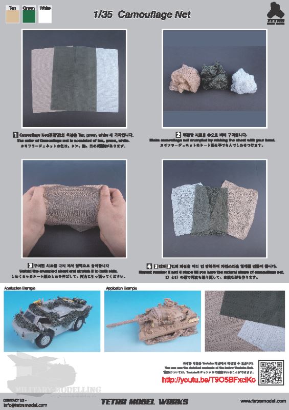 Sieht man sich Fotos von modernen Gefechtsfahrzeugen im Einsatz an, so sind diese zumeist mit Tarnung versehen. Am häufigsten werden hierzu, neben Echttarnung, Tarnnetze verwendet, welche am Fahrzeug befestigt oder auch einfach nur so mitgeführt werden. Gibt es nun vielfältige Arten diese im Modellbau nachzubauen, beschert uns Tetra Model Works nun Tarnnetze im Maßstab 1.35 in 3 verschiedenen Farben, welche ich hier gerne vorstelle.