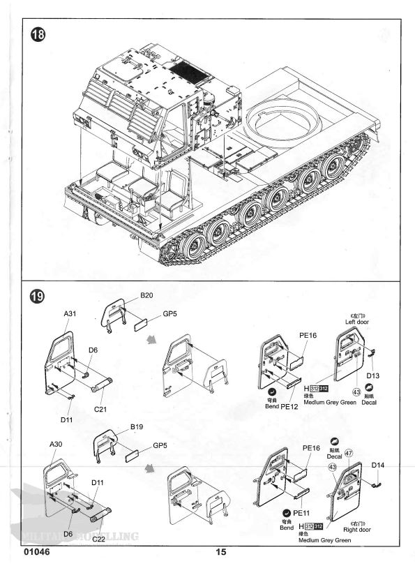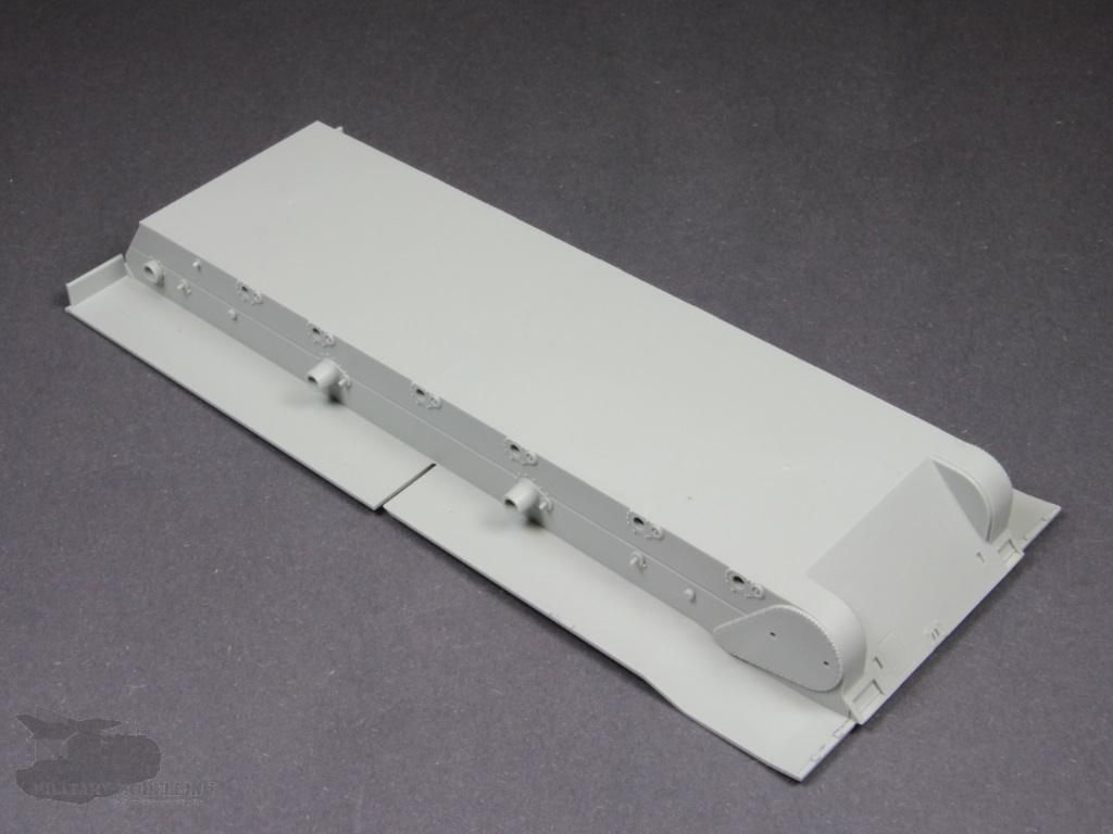 Die Unterwanne wird als komplettes, einteiliges Bauteil mitgeliefert. Wie bisher üblich sind daran die Schwingarme des Bradley-Fahrwerkes durch einkleben zu befestigen. Trumpeter hat hier bewusst auf ein beweglich darstellbares Fahrwerk verzichtet. Mit etwas modellbauerischem Geschick lässt es sich aber dennoch an ein Gelände anpassen. Das Heck- und die Front der Wanne sind stimmig und mit den nötigen Details wie Leitkreuz, Heißösen mit Schäkeln, Rückleuchten und Halterungen für das Abschleppseil versehen. Das Abschleppseil ist als Spritzgussteil ausgebildet und steht in einem Kupferseil in nichts nach. Die seitlichen Kettenschürzen werden in der angepassten deutschen, kurzen Variante stimmig mitgeliefert.