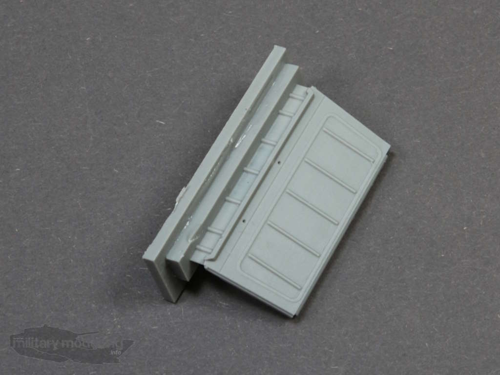 Schauen wir uns die Bauteile mal näher an und beginnen mit dem San-Aufbau. Hierbei handelt es sich um das größte Bauteil des Umbausatzes. Aus einem Guss ist die San-Kabine erstellt. Die Wandungen sind verfahrensbedingt recht dick. Die Details wie Nieten, Schlösser und Türen sind gelungen. Zeitaufwendig, die Versäuberung des Angusses.