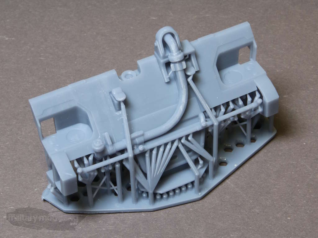 Das obere Schutzgitter und auch die Sprühanlage des Fahrerhauses sind als separate Bauteile vorhanden. Auch hier gibt es keinen Grund zur Kritik. Beim Freilegen der Bauteile von den Stützstrukturen ist allerdings Vorsicht geboten. Sonst kommt es unweigerlich zum Bruch der fein gemachten Bauteile.